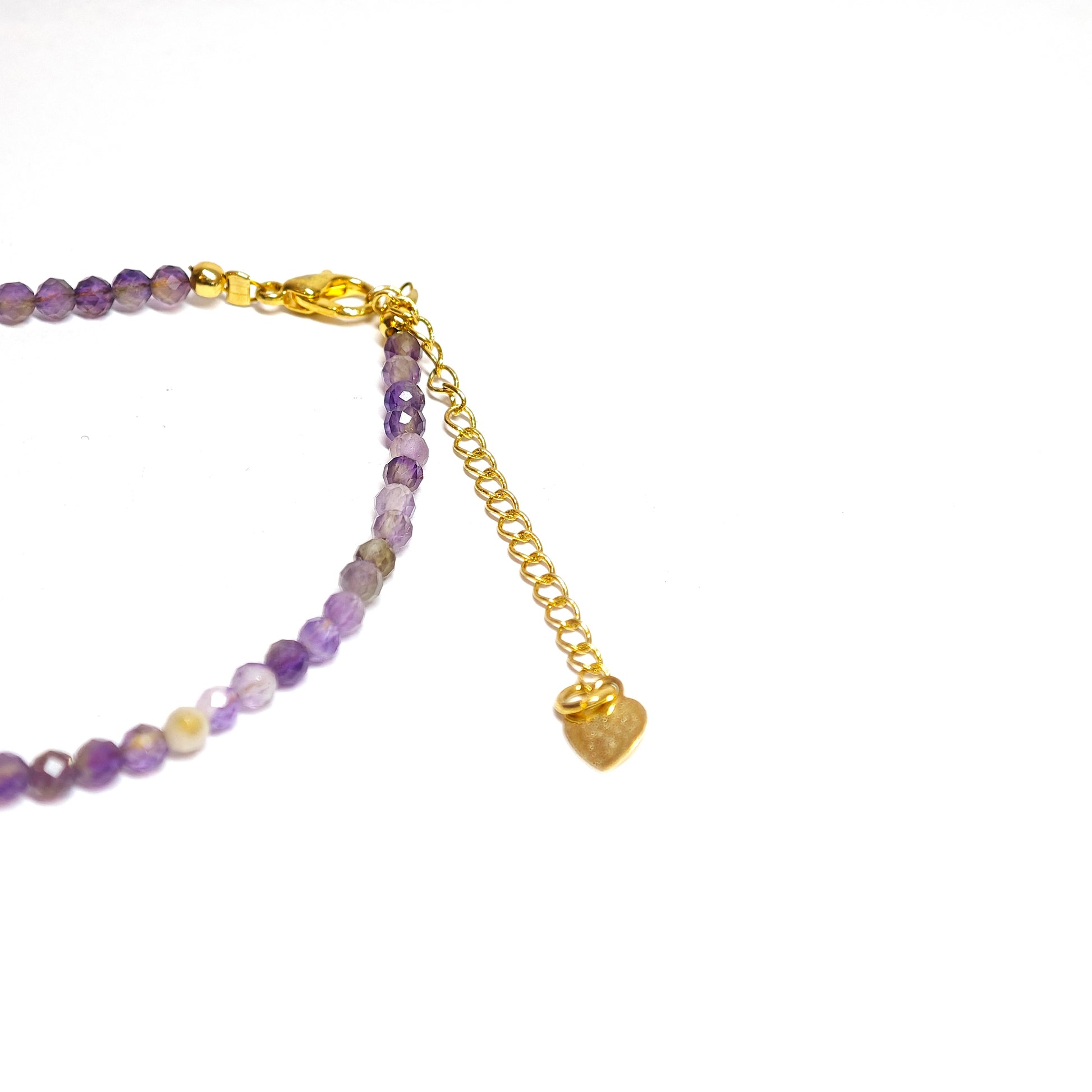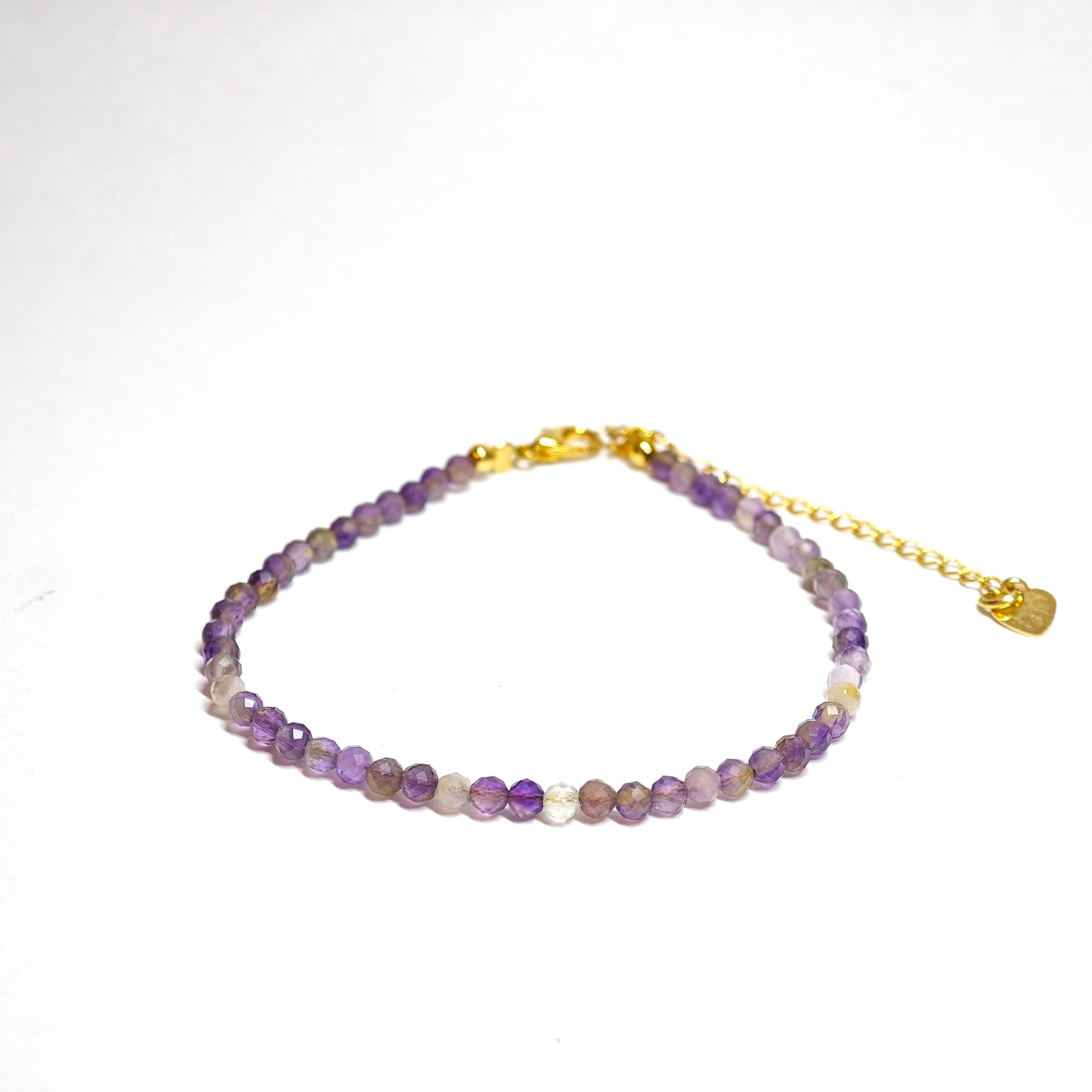 Dieses Armband besteht aus fein facettiertem Amethyst und etwas hellem Kristall, die zusammen einen sanften Glanz erzeugen. Die violette Farbnuance, von hell bis tief, erinnert an den Übergang zwischen Nacht und Morgengrauen. Goldfarbene Elemente verleihen dezente Eleganz.