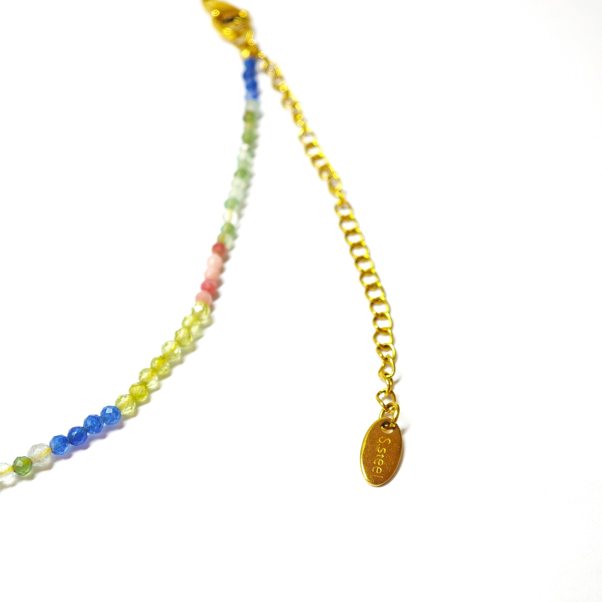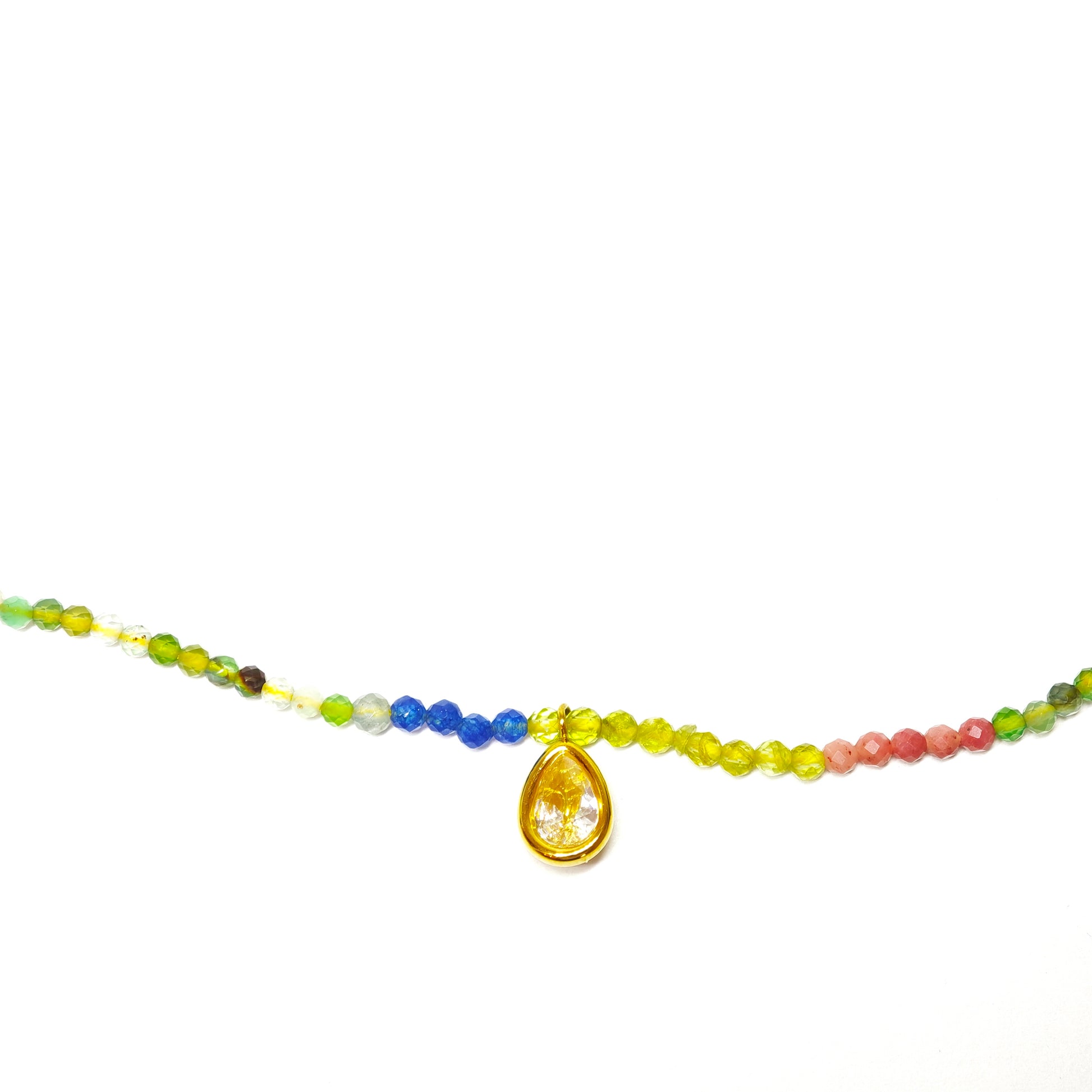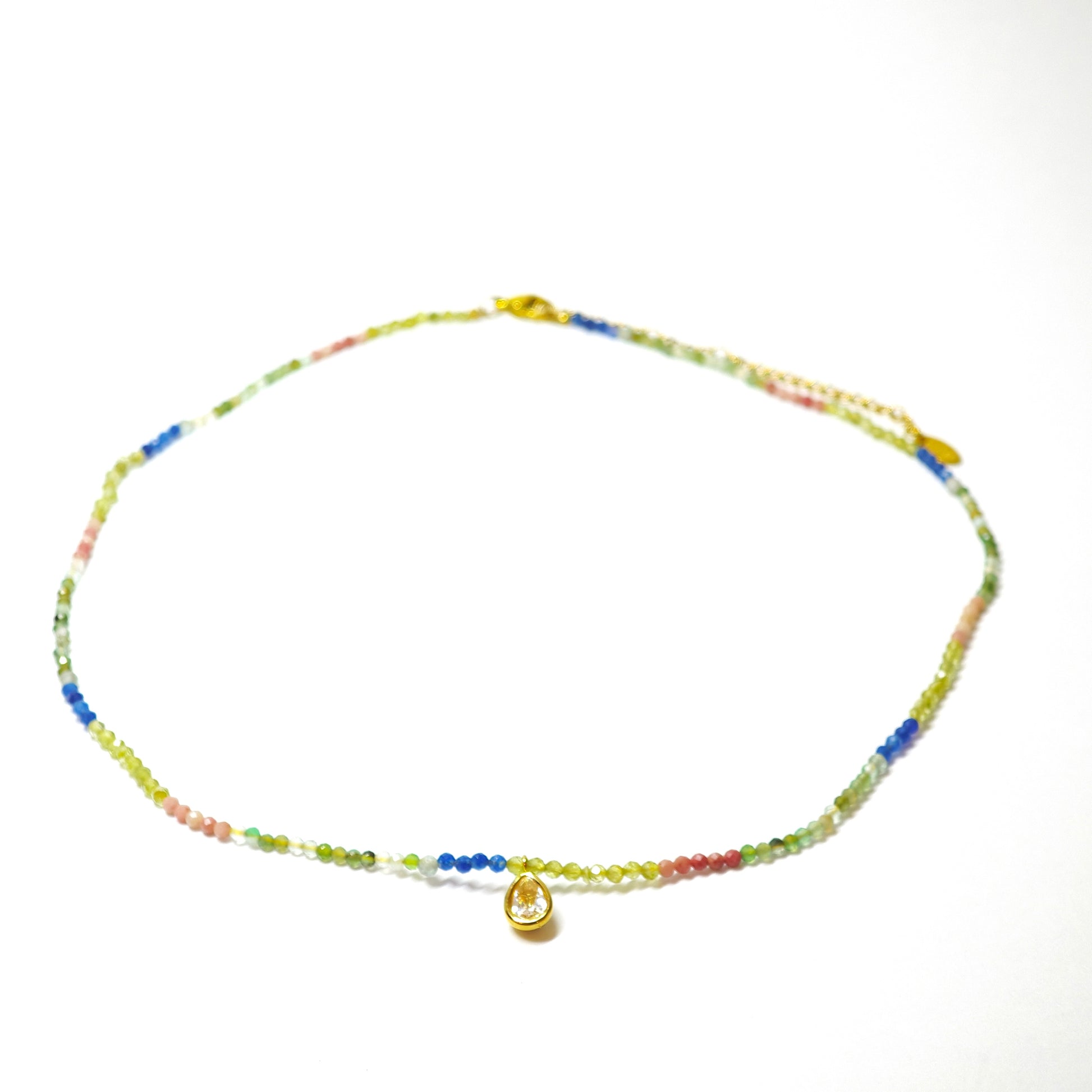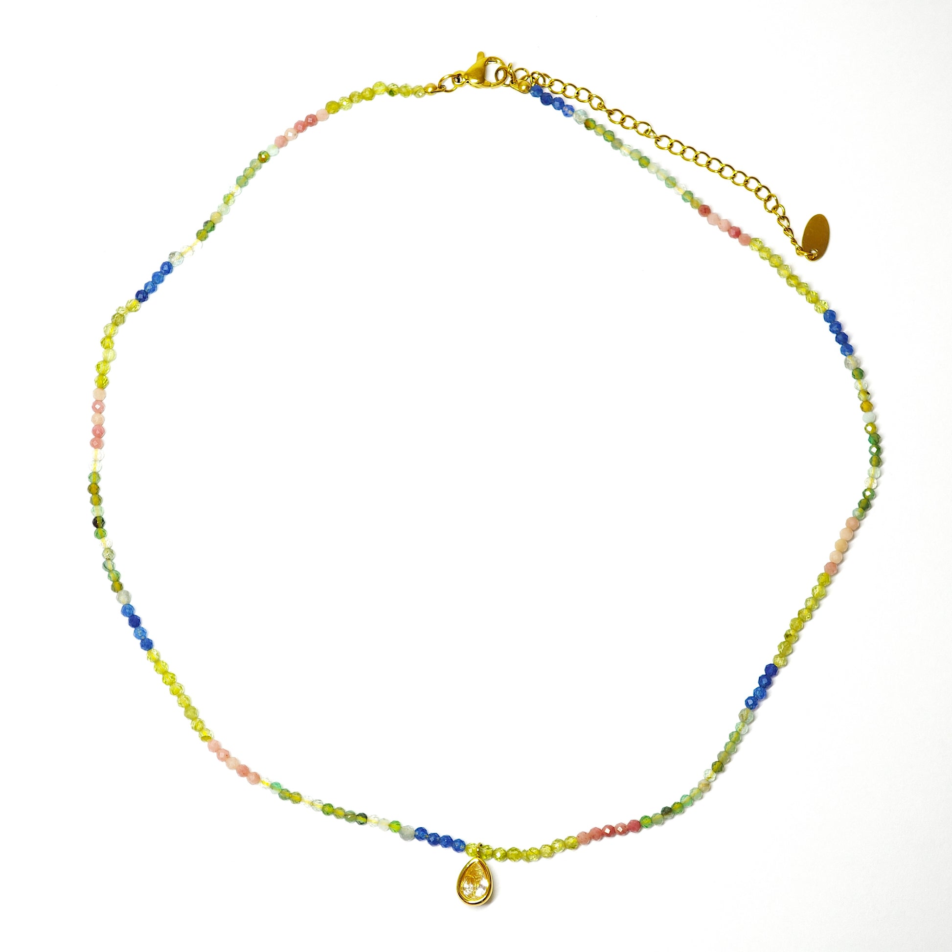 Diese Halskette besteht aus feinen, bunten Zirkonperlen in Grün, Blau, Rosa und Gelb – wie ein süßer Sommertraum aus Farben. In der Mitte glänzt ein tropfenförmiger Katzenaugestein mit goldener Fassung – zart, leuchtend und verspielt.