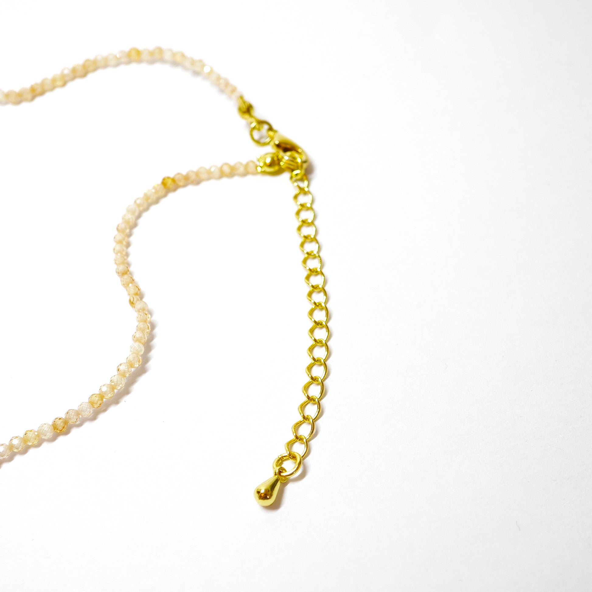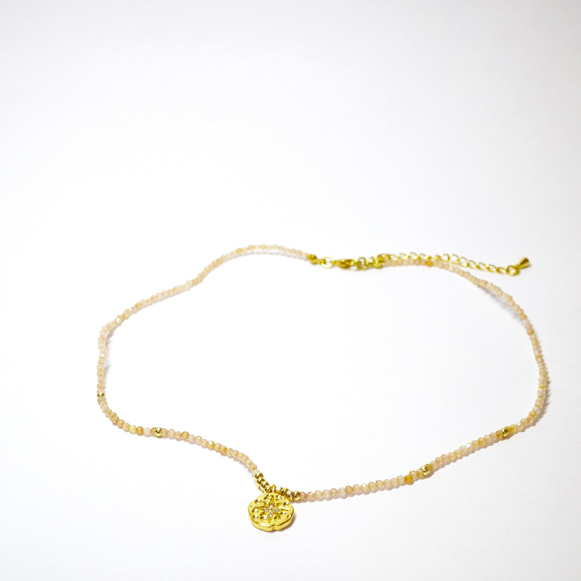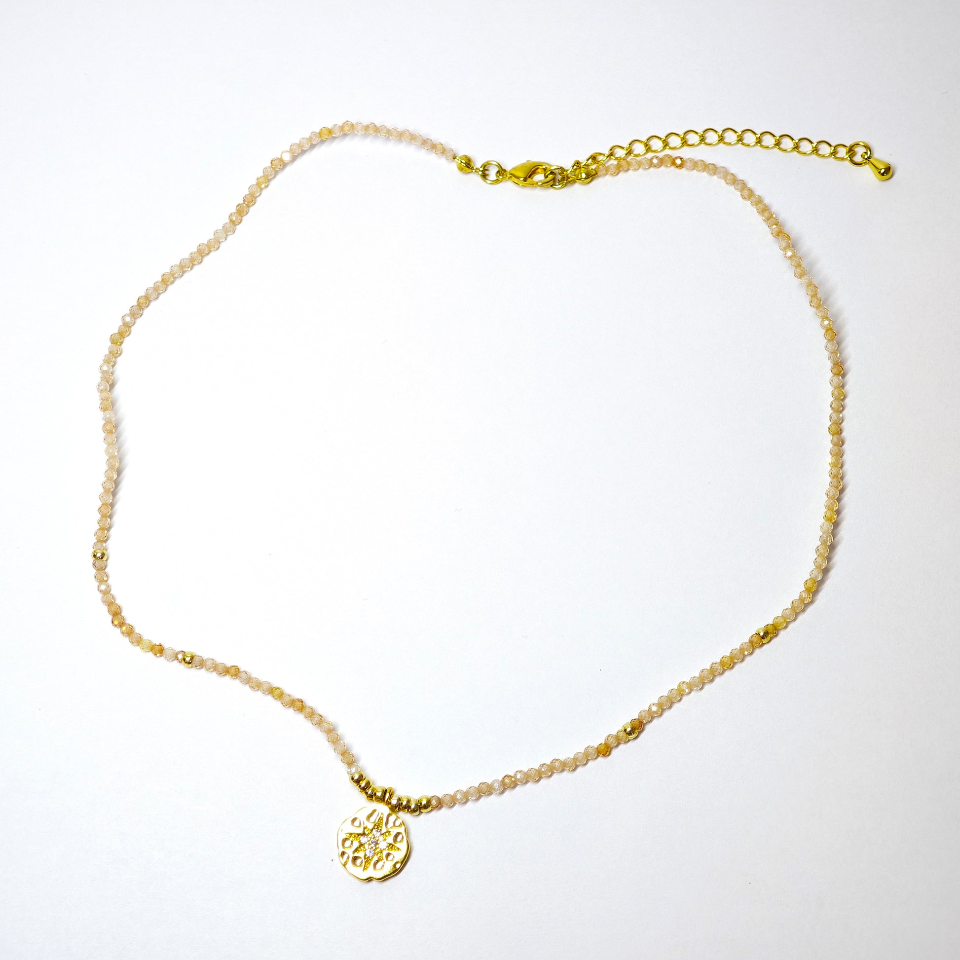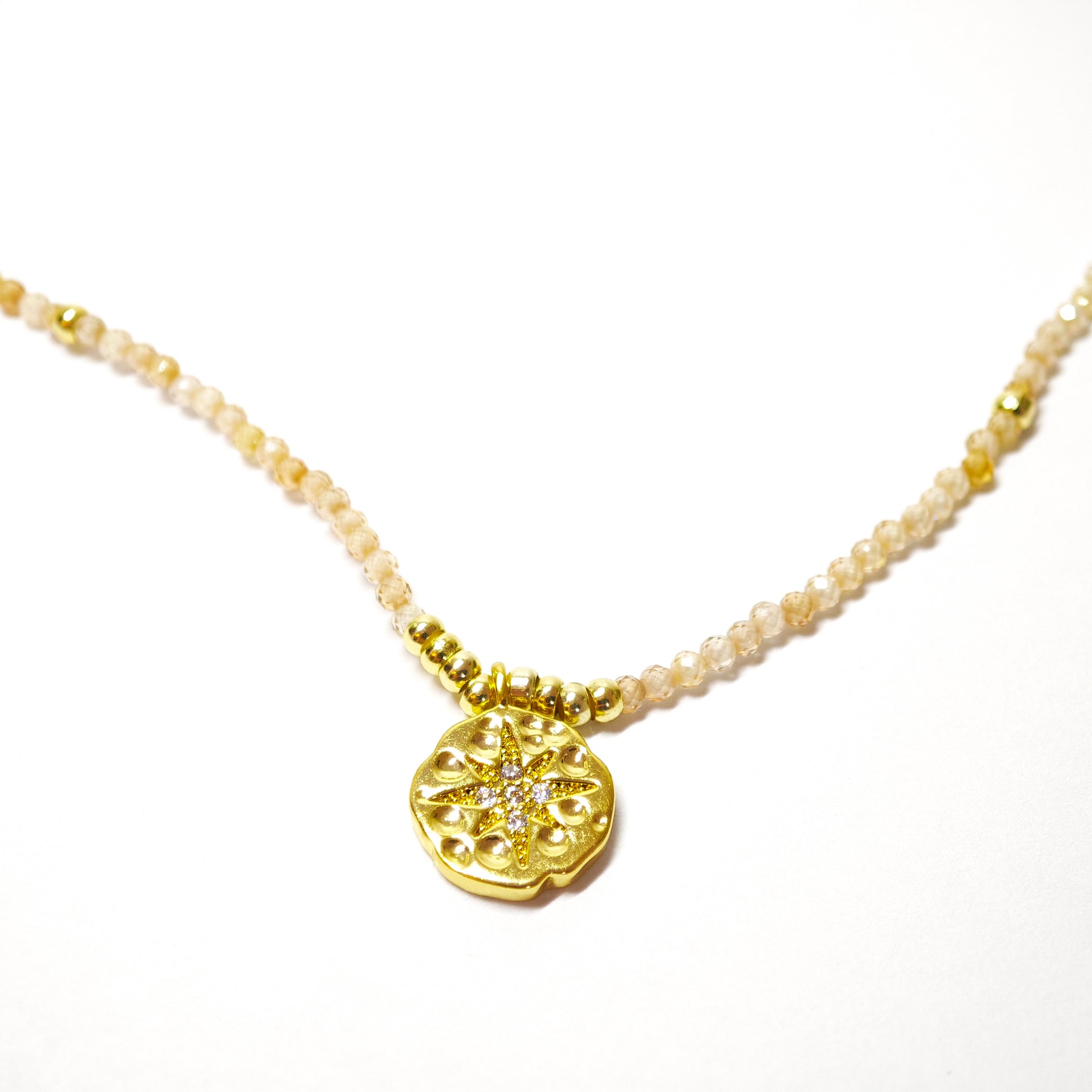 Zart geschliffene Zirkonperlen in Champagnerfarbe schimmern sanft wie Morgensonne. In der Mitte: ein filigranes goldfarbenes Medaillon – wie ein Talisman für Hoffnung und Glück.