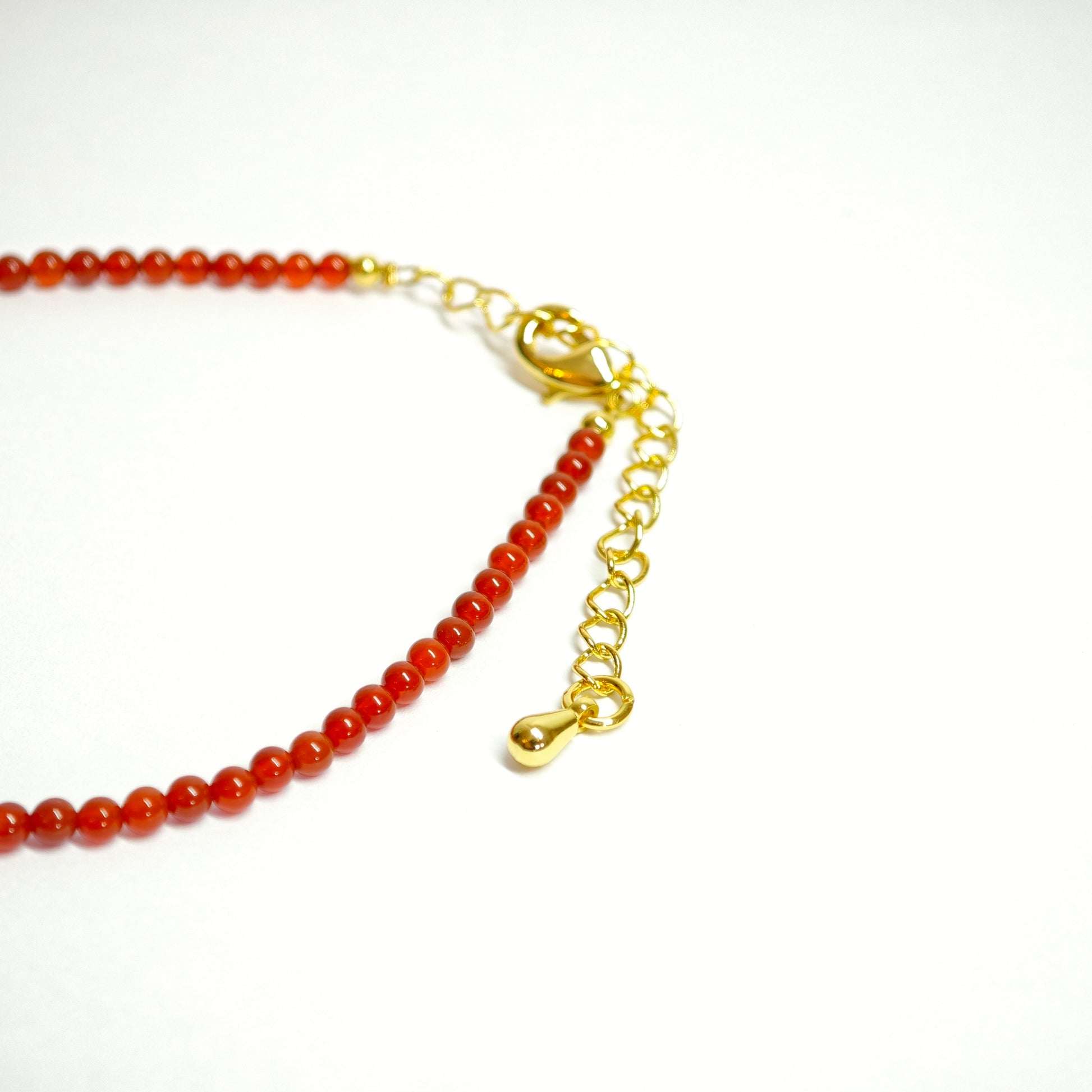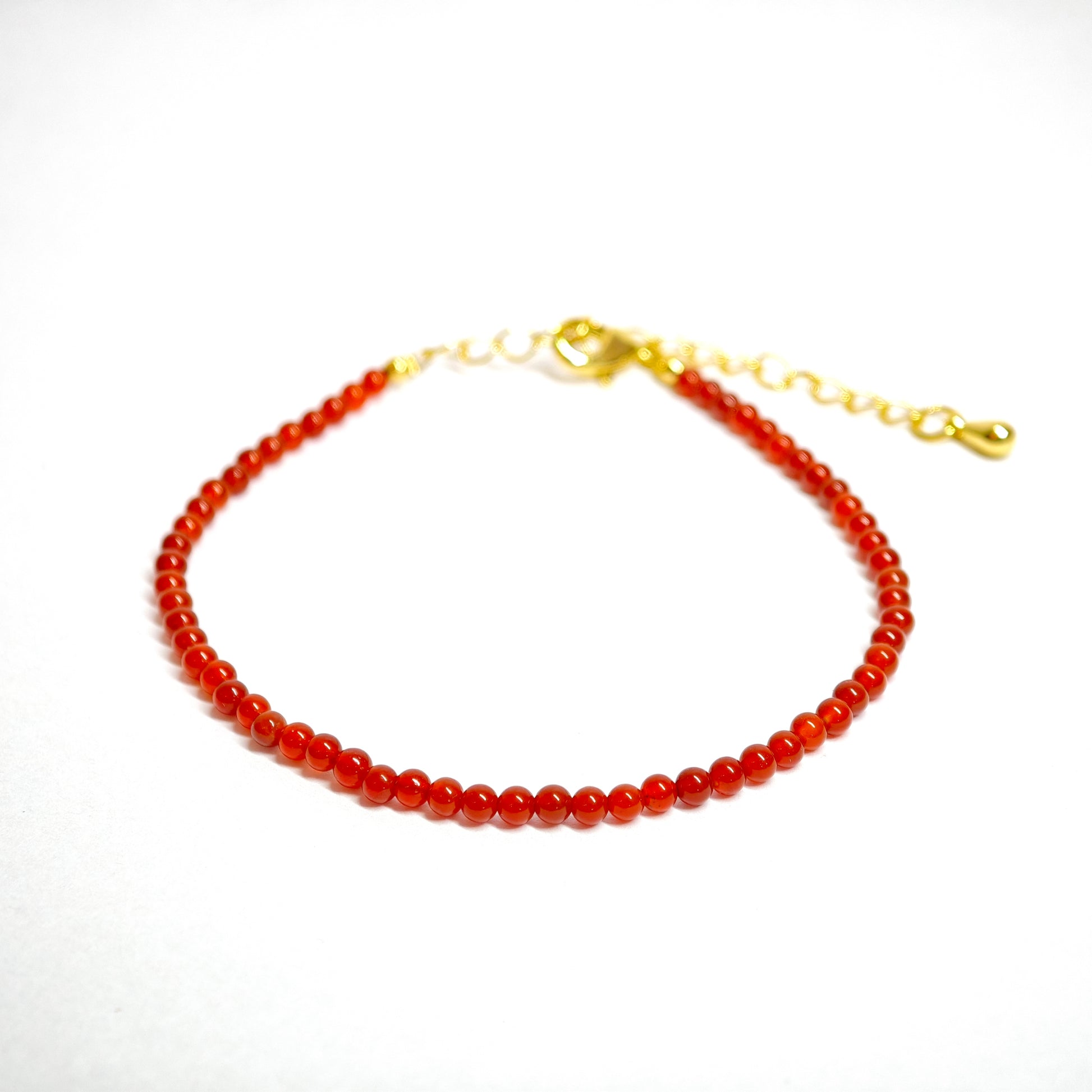 Aus kleinen, glatten Karneol-Perlen gefertigt und mit einem filigranen goldfarbenen Verschluss versehen, wirkt dieses Armband leicht und minimalistisch – ideal am Handgelenk.