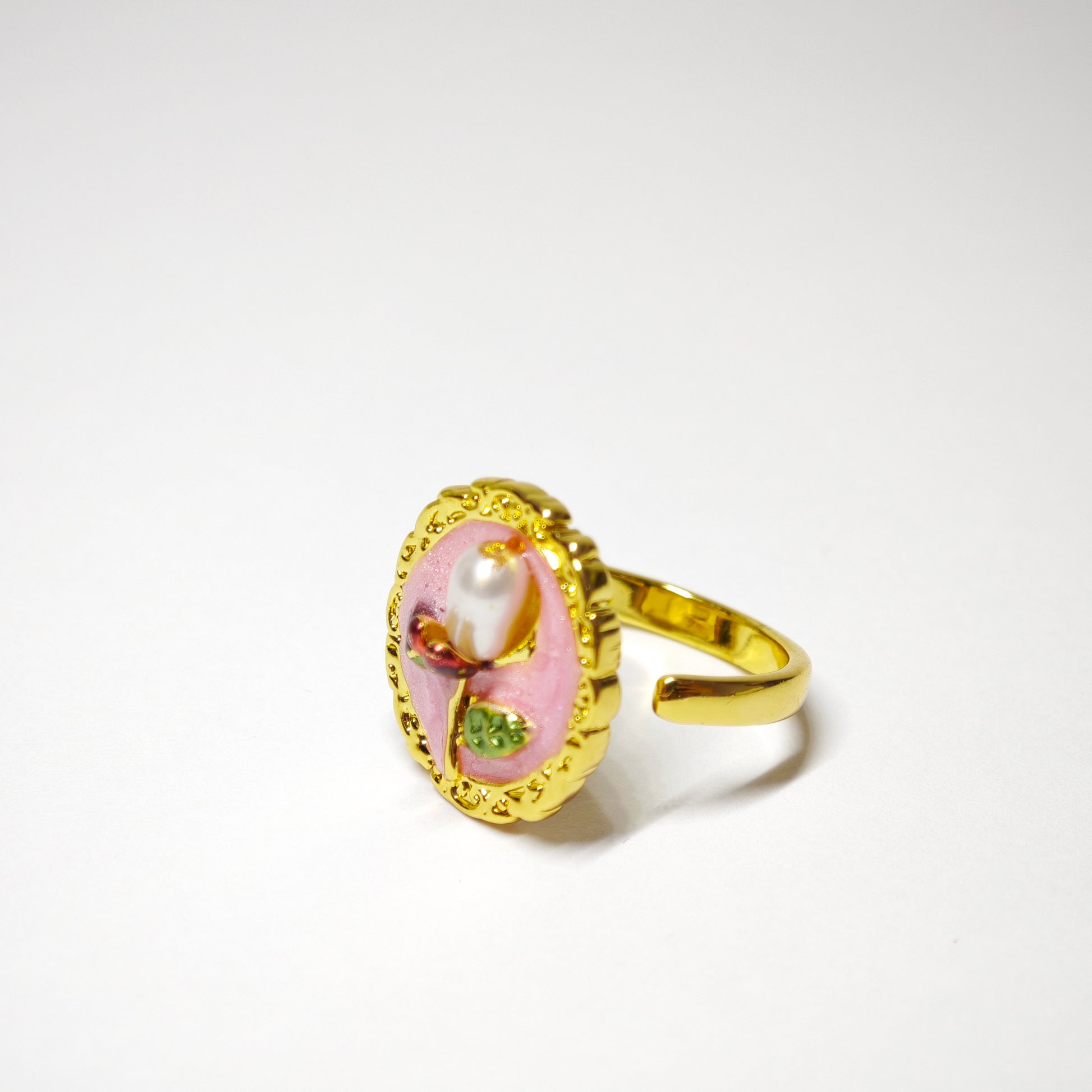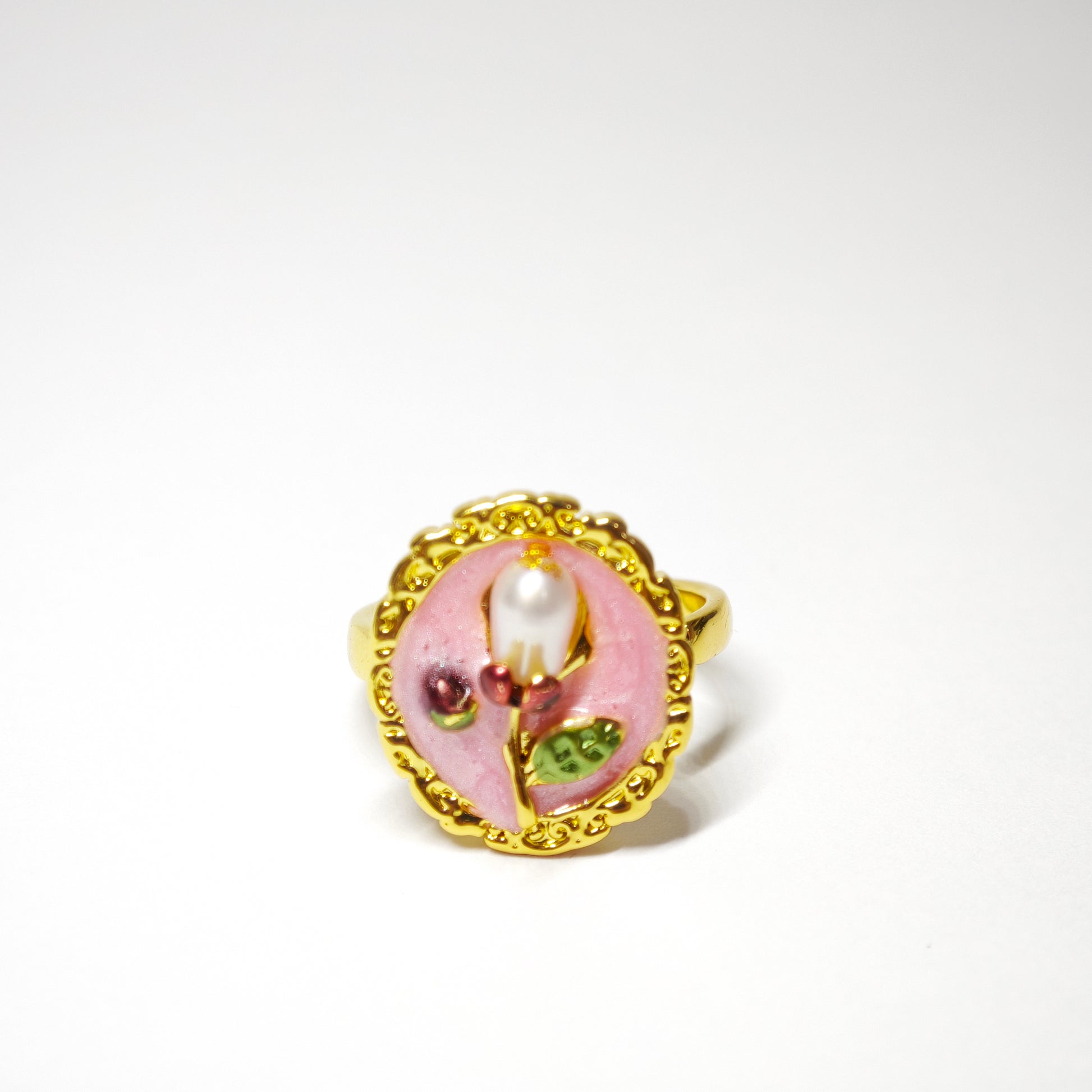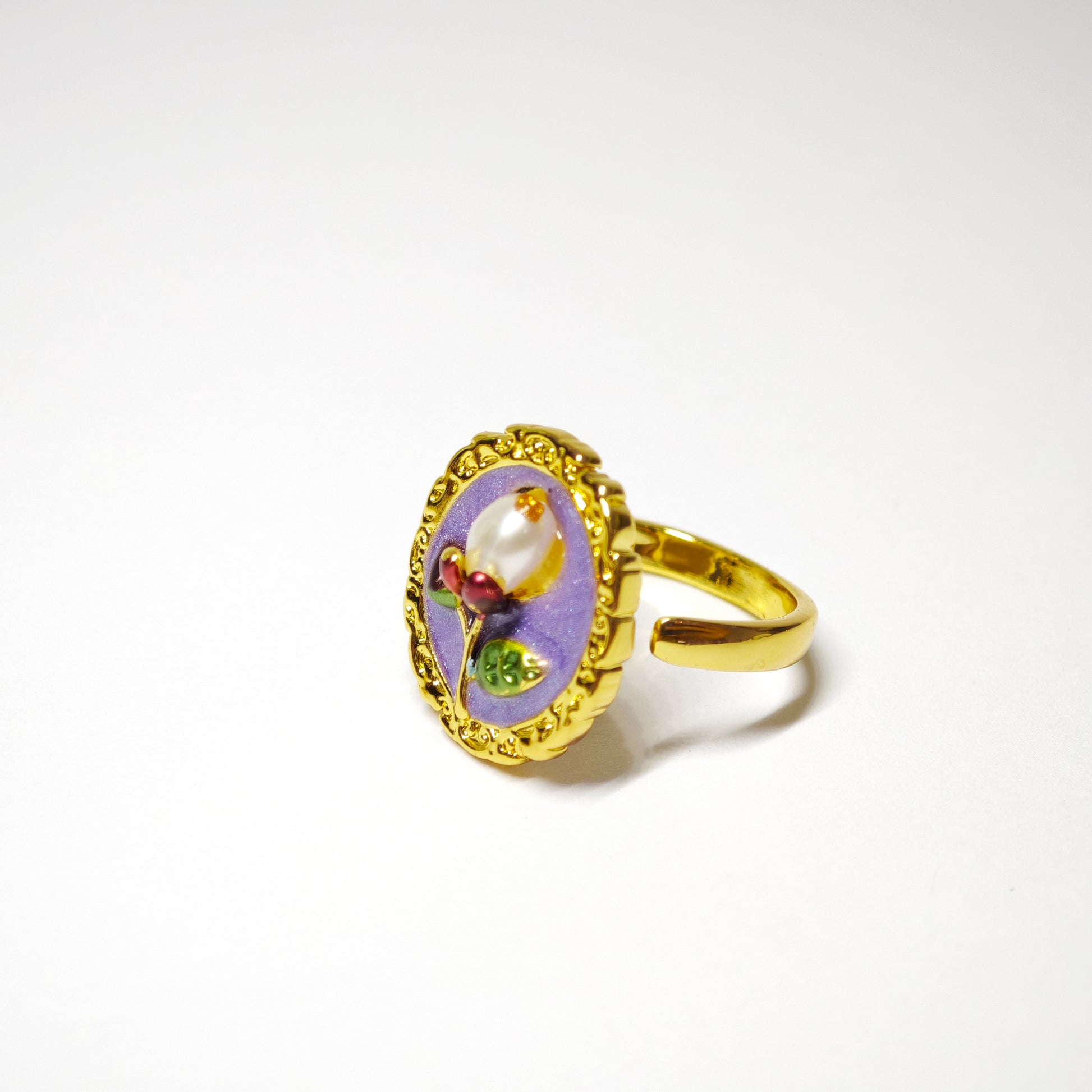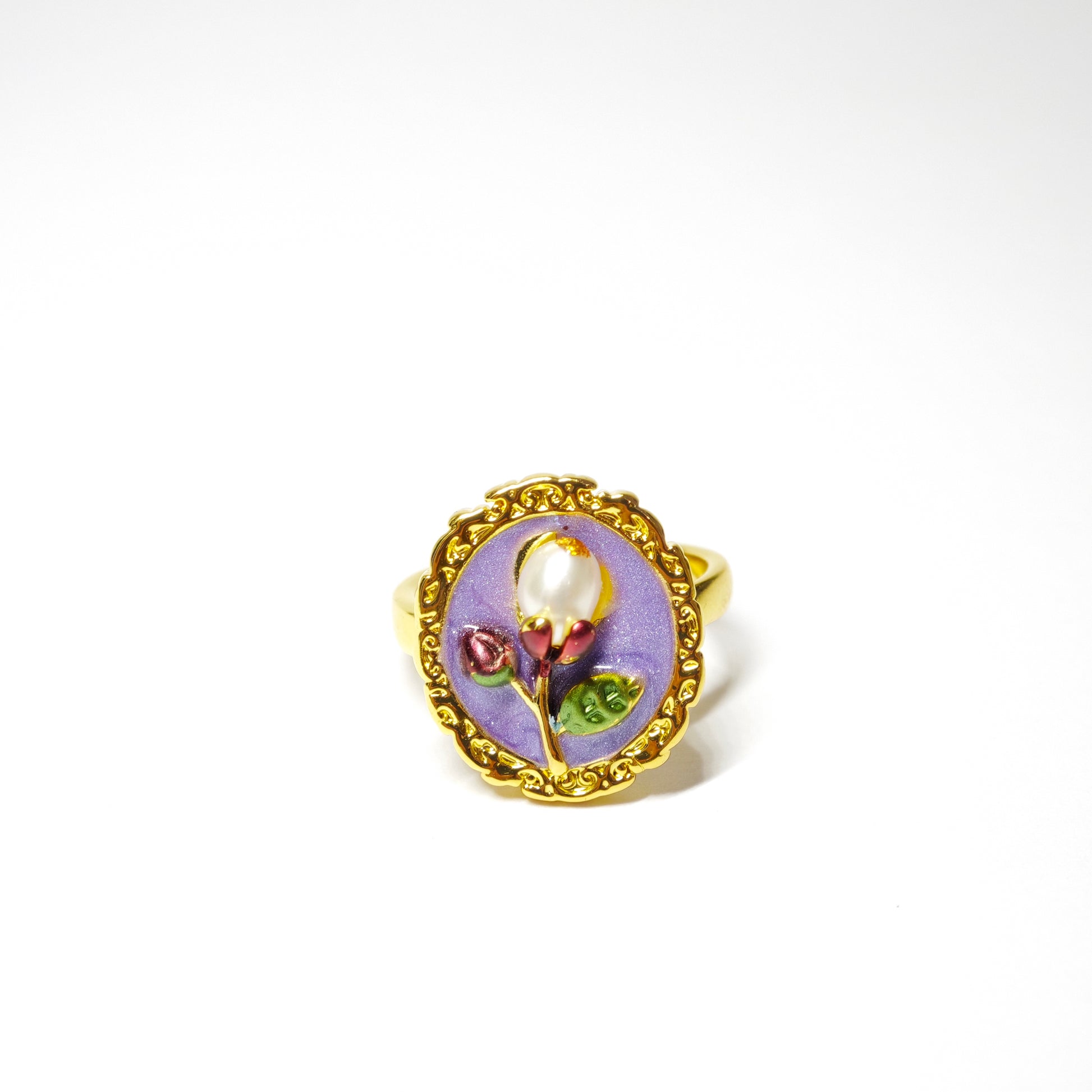 Diese beiden Ringe – einer in zartem Rosa, der andere in ruhigem Violett – zeigen eine blühende Blume in einem goldenen, ovalen Rahmen. Die Knospen sind rot emailliert, das Blattwerk grün betont, und in der Mitte strahlt eine barocke Perle wie das Herz einer erwachenden Blüte.