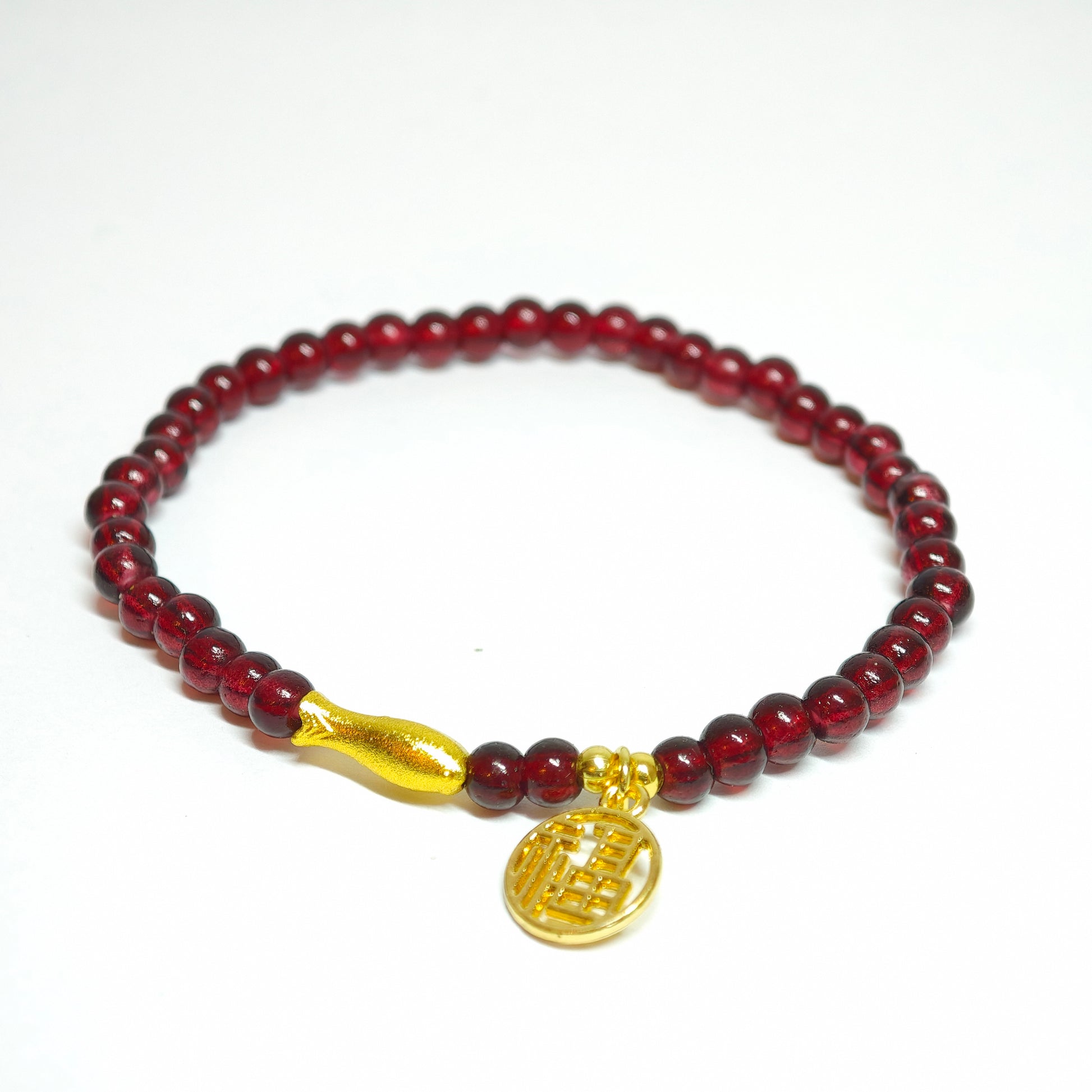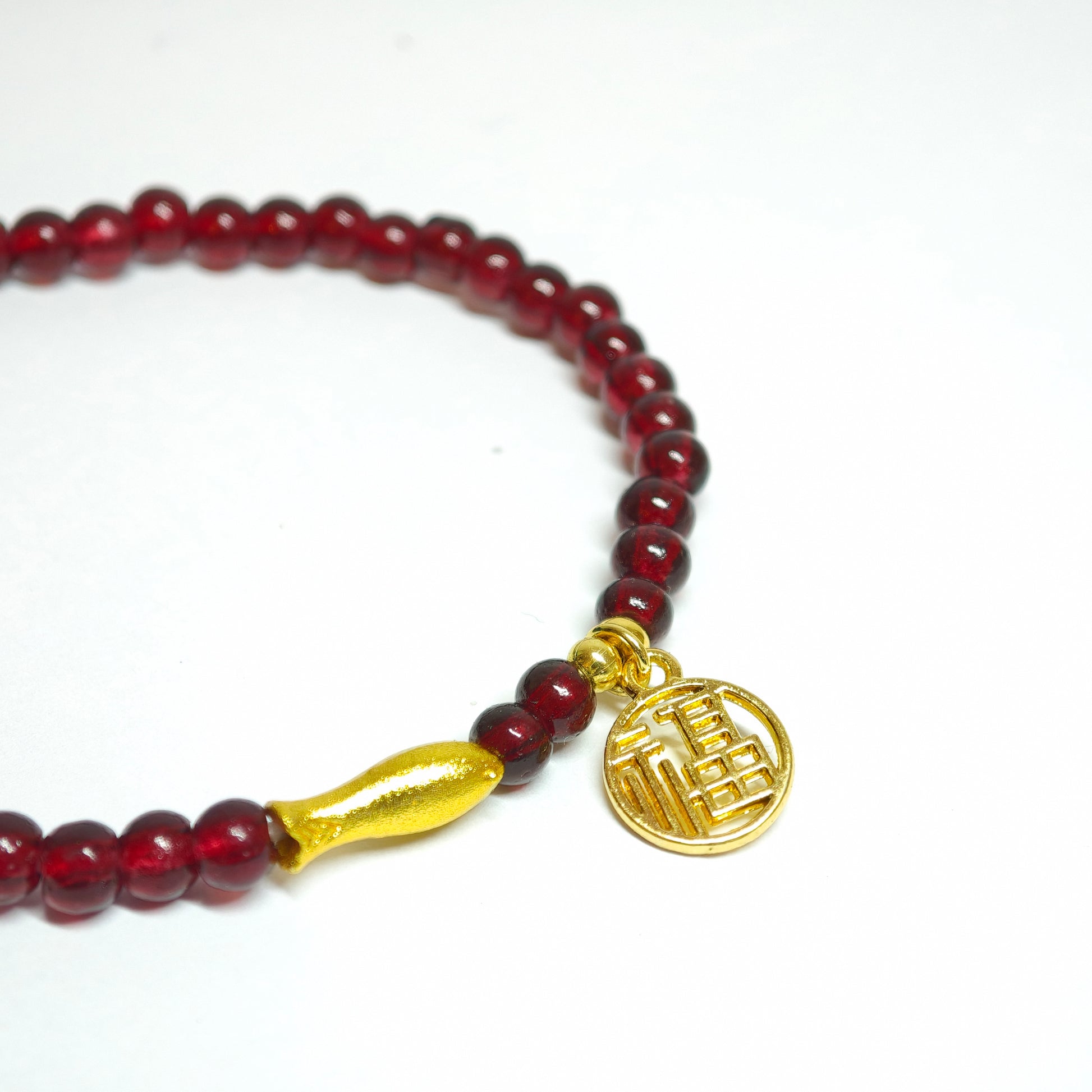 Gefertigt aus feinen, glatten Granat-Perlen in tiefem Weinrot mit sanftem Schimmer. In der Mitte ein goldener Goldfisch und ein kleiner „Fu“-Anhänger, die Freude und Glück symbolisieren.