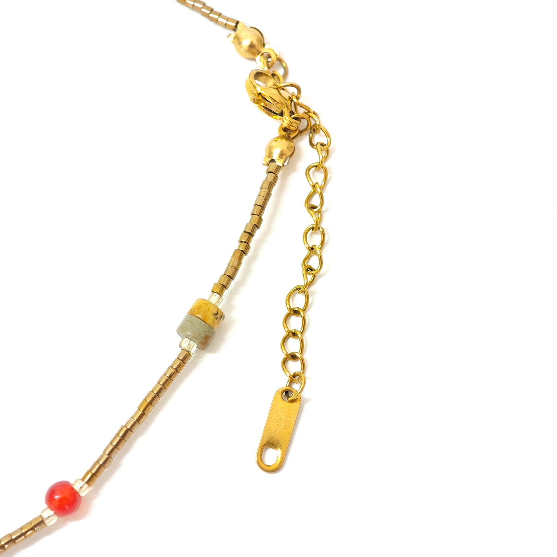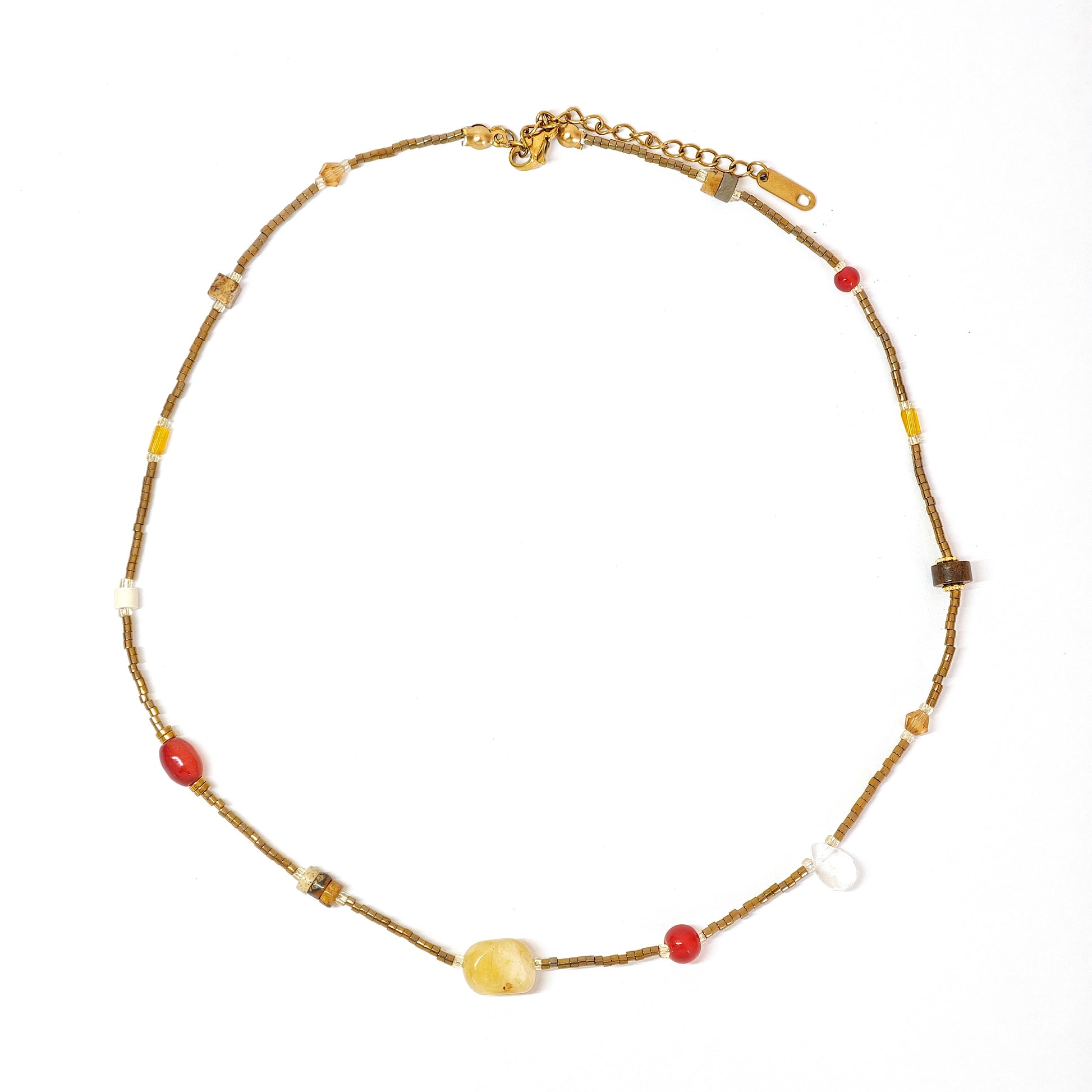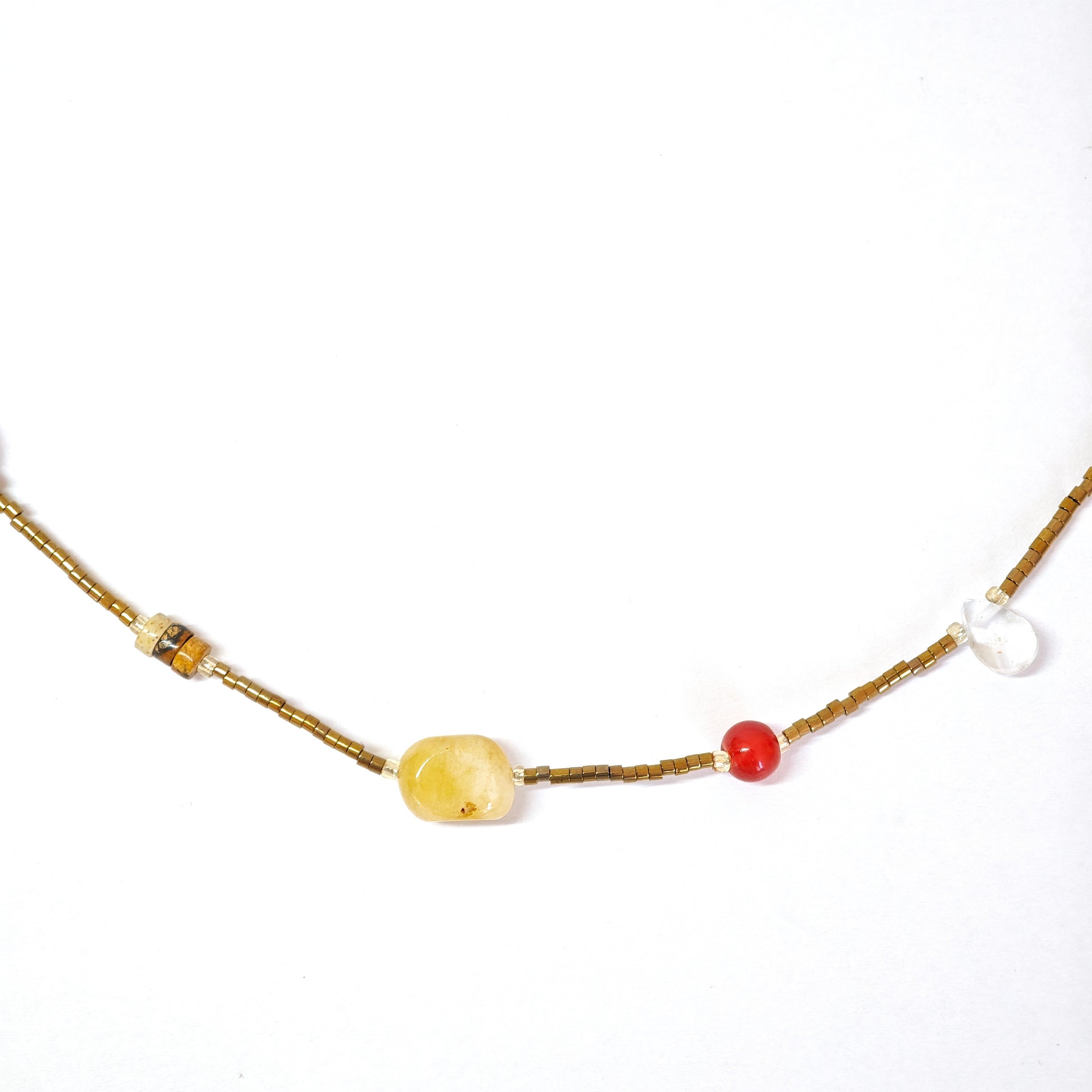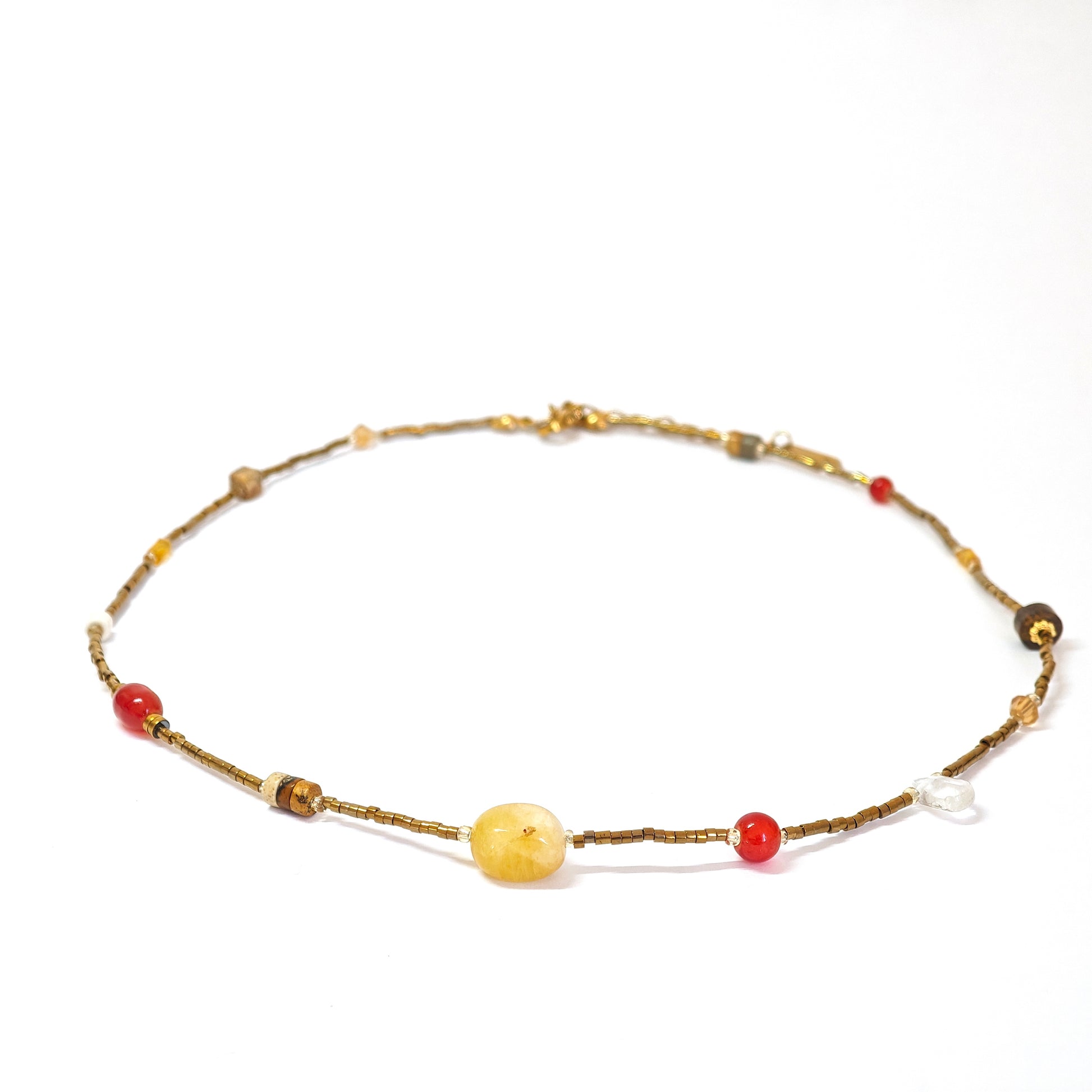 Feine goldfarbene Glasperlen bilden die Basis dieser Kette, im Zentrum eine volle Citrinperle, flankiert von rotem Achat und klarem Bergkristall. Das warme Gelb des Citrins harmoniert mit den goldenen Perlen, roter Achat bringt lebendige Wärme, während Bergkristall für Reinheit und Balance sorgt. Leicht und angenehm zu tragen.