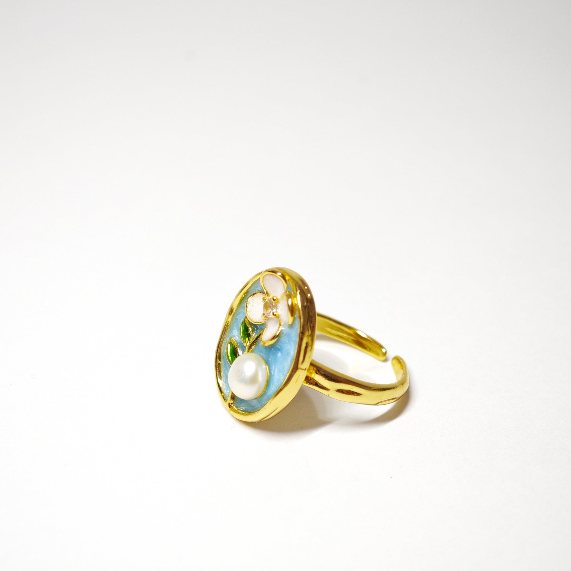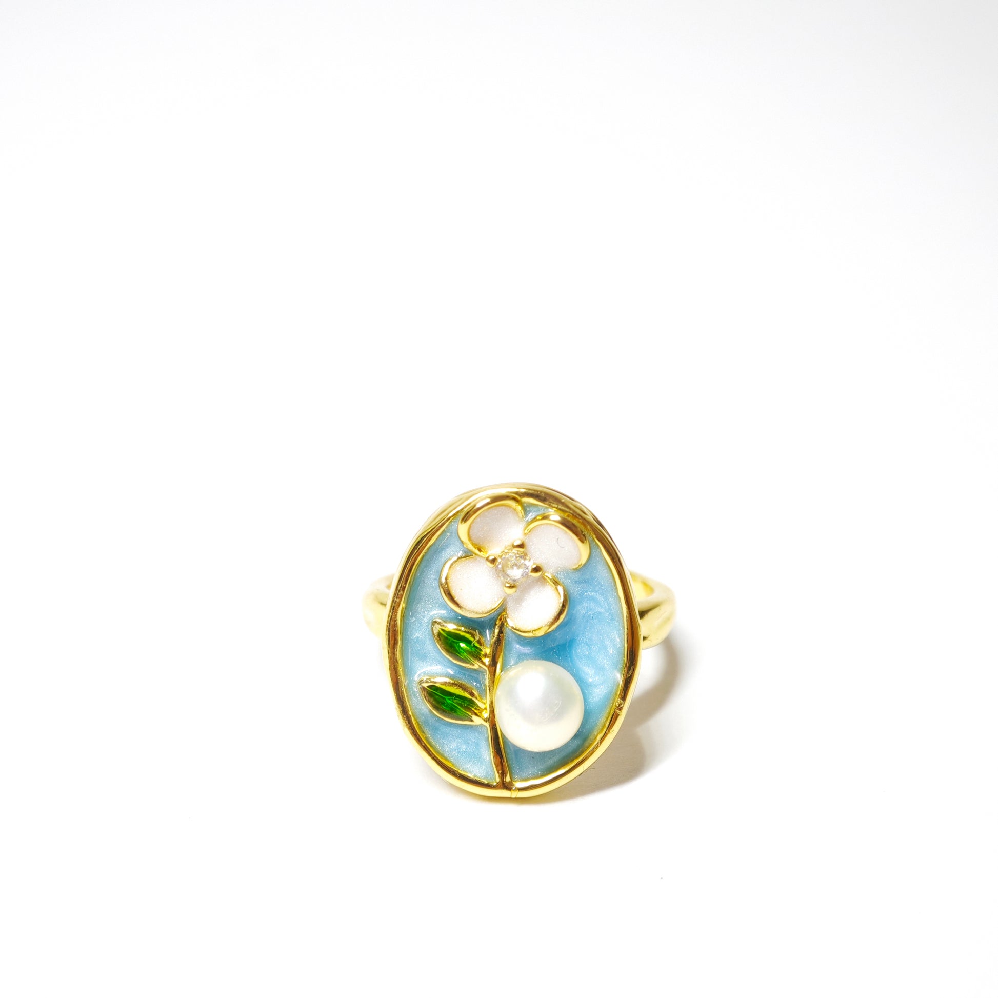Der Ring „Himmelspflanze“ besteht aus vergoldetem Messing und trägt eine ovale Fläche, ausgegossen mit hellblauem, handgegossenem Harz – wie ein Stück klarer Morgenhimmel. Im Zentrum erblüht eine zarte weiße Emailleblume mit funkelndem Kristallkern, flankiert von zwei grünen Blättern und einer sanften Perle wie ein Tropfen Morgentau. Das Design erinnert an eine Wildblume, die unter einem endlosen Sommerhimmel im Wind tanzt.