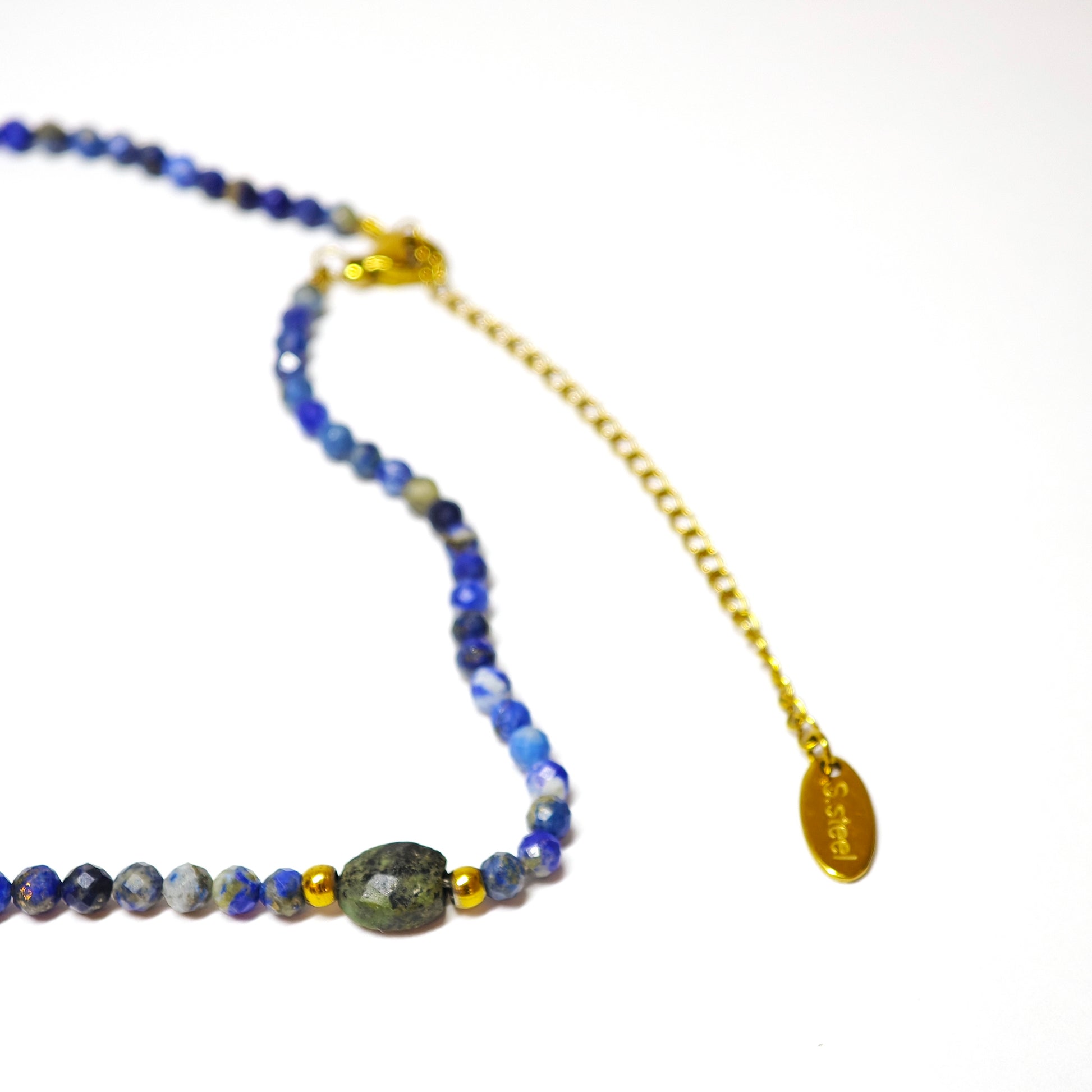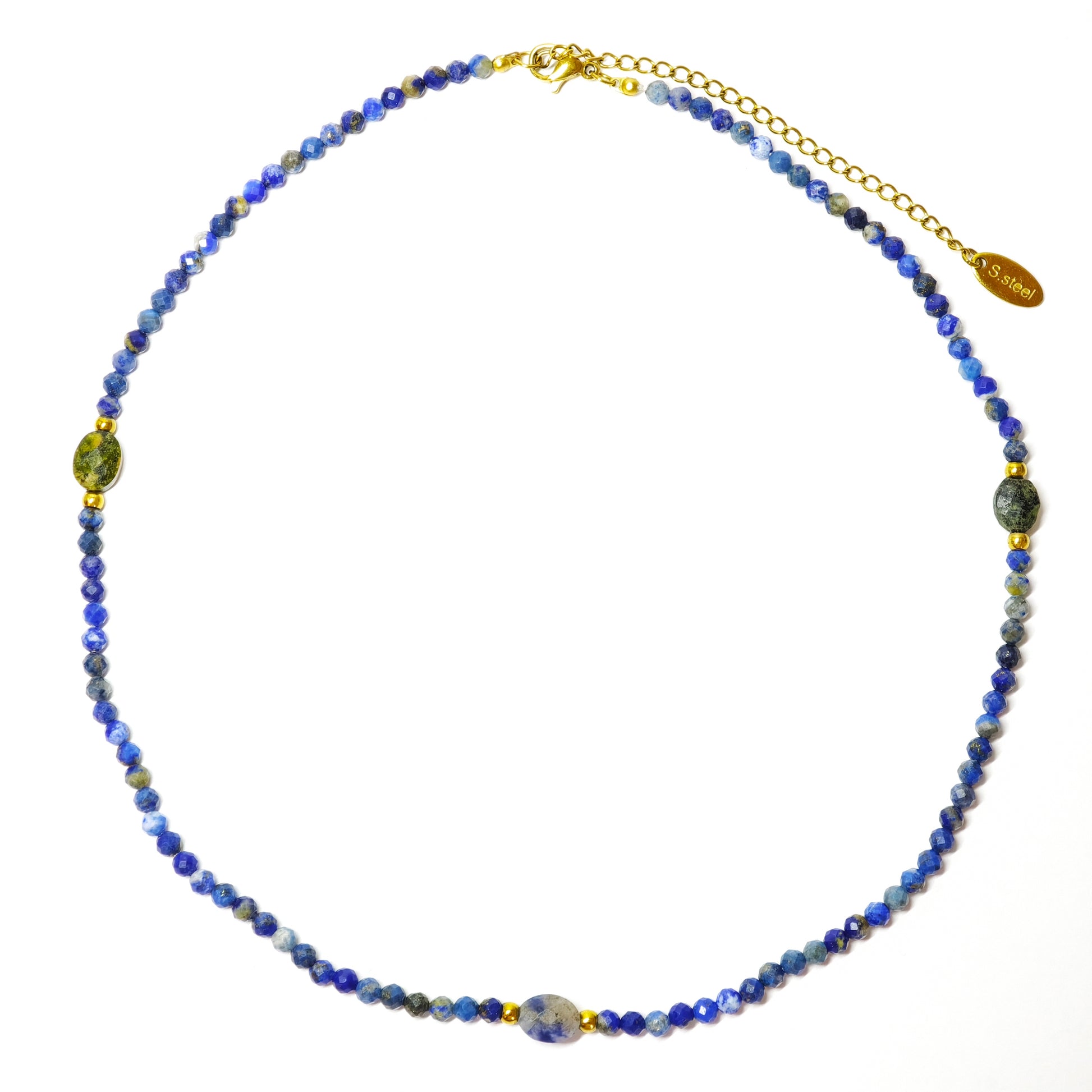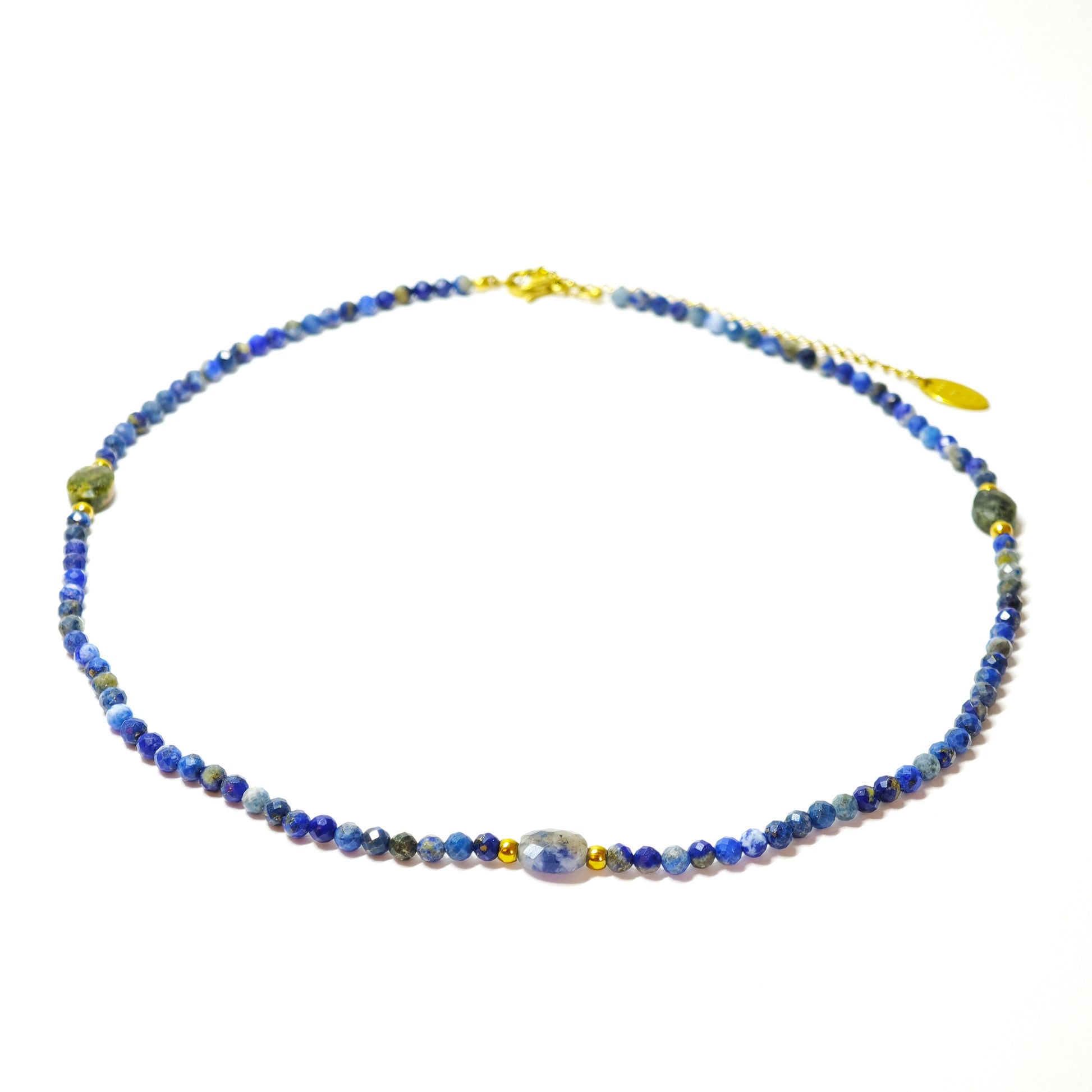 Diese Halskette besteht aus facettierten Lapislazuli-Perlen in tiefem Blau, veredelt mit kleinen goldenen Elementen. Einzelne ovale Steine aus Lapislazuli und Peridot setzen elegante Akzente – wie leuchtende Sterne am Nachthimmel.