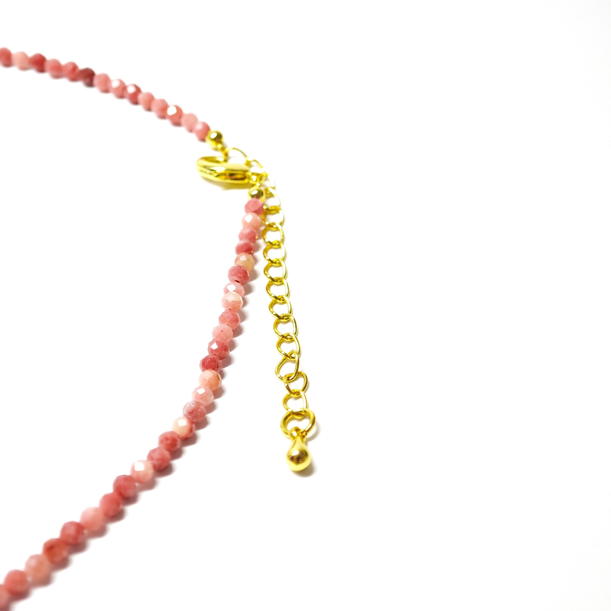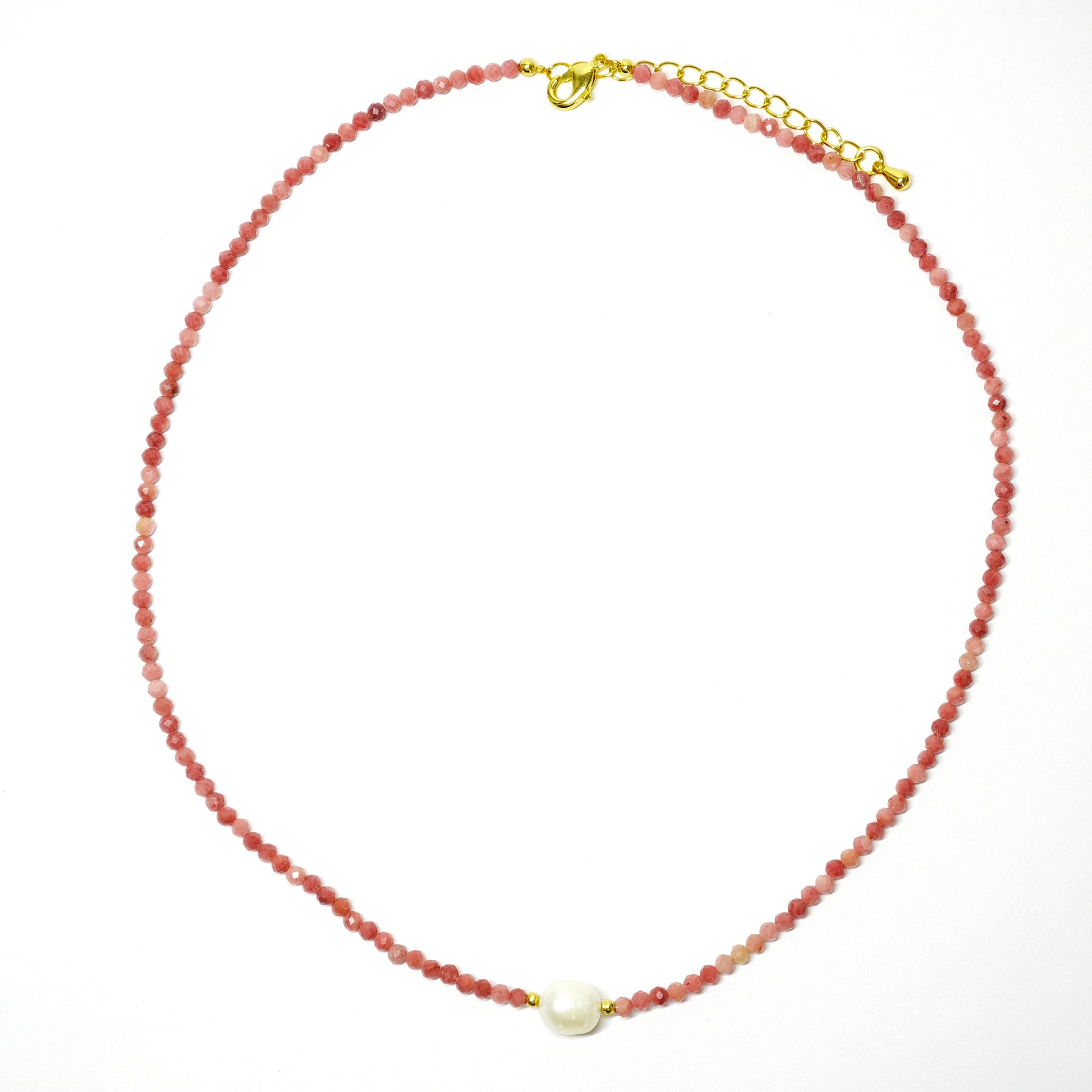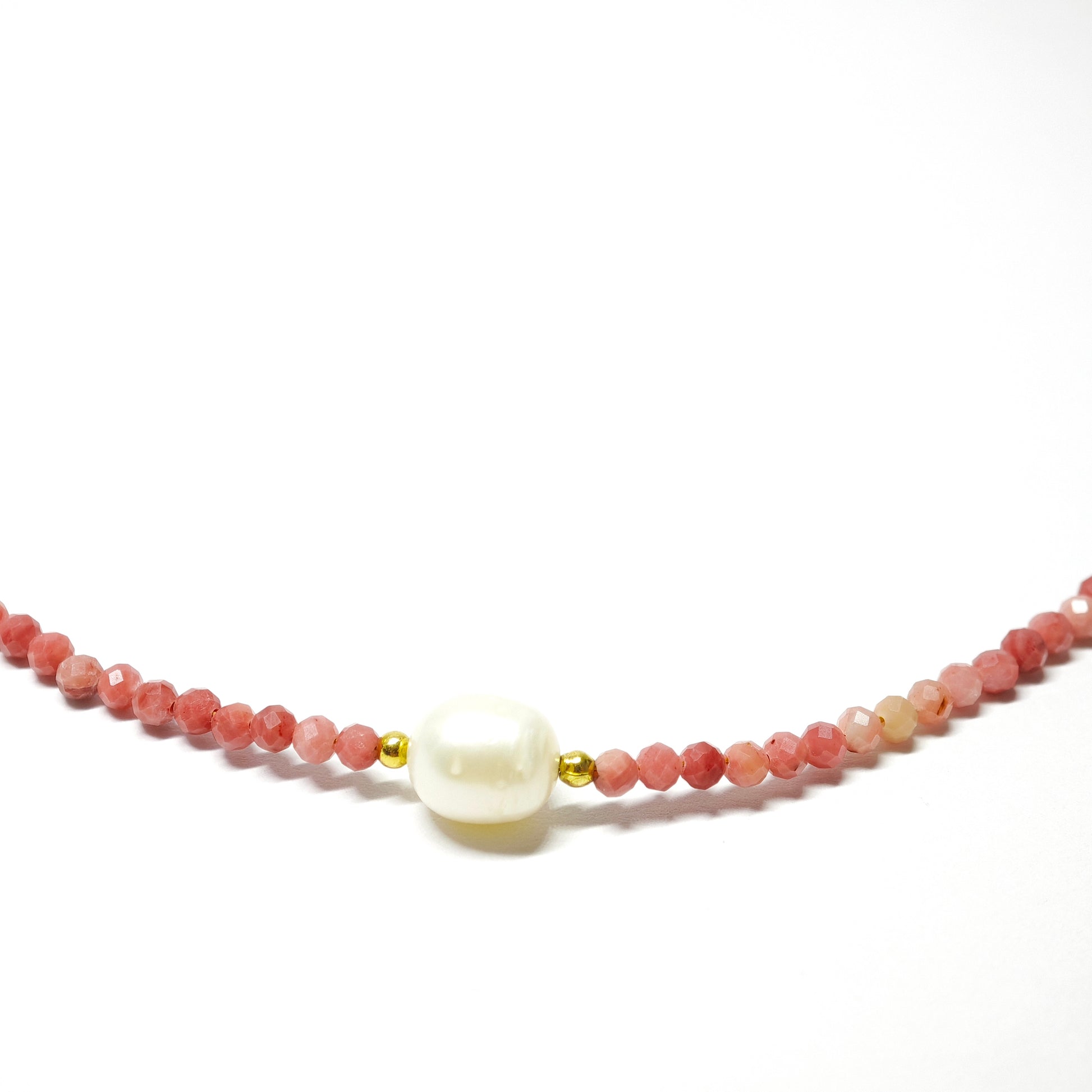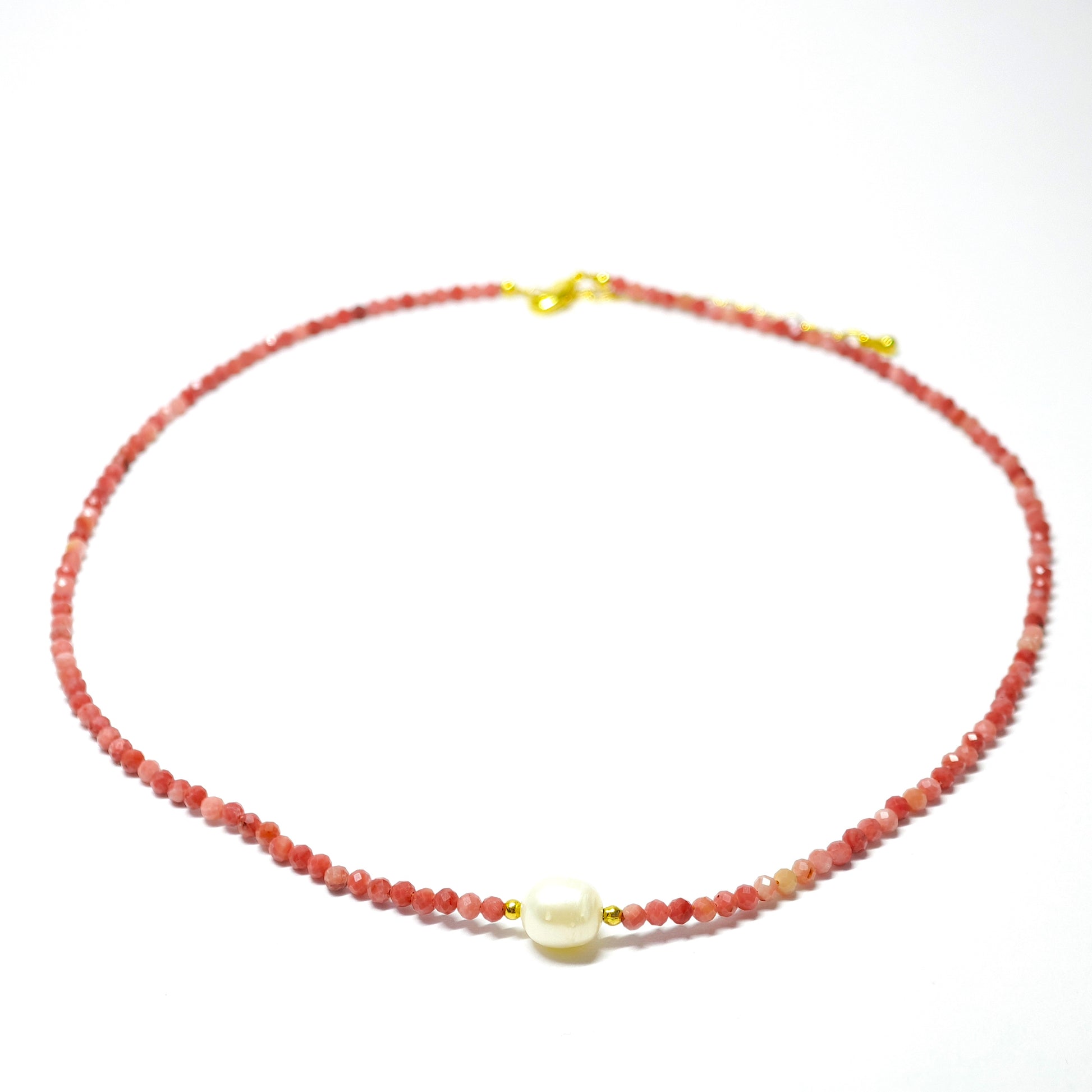 Diese Halskette besteht aus facettierten Rhodochrosit-Perlen in warmem Rosa, ergänzt durch eine auffällige große Barockperle als Mittelpunkt und vergoldete Details. Im Vergleich zur Version mit kleiner Perle wirkt sie präsenter, strukturierter und charakterstärker – ideal für Frauen mit klarer Haltung.