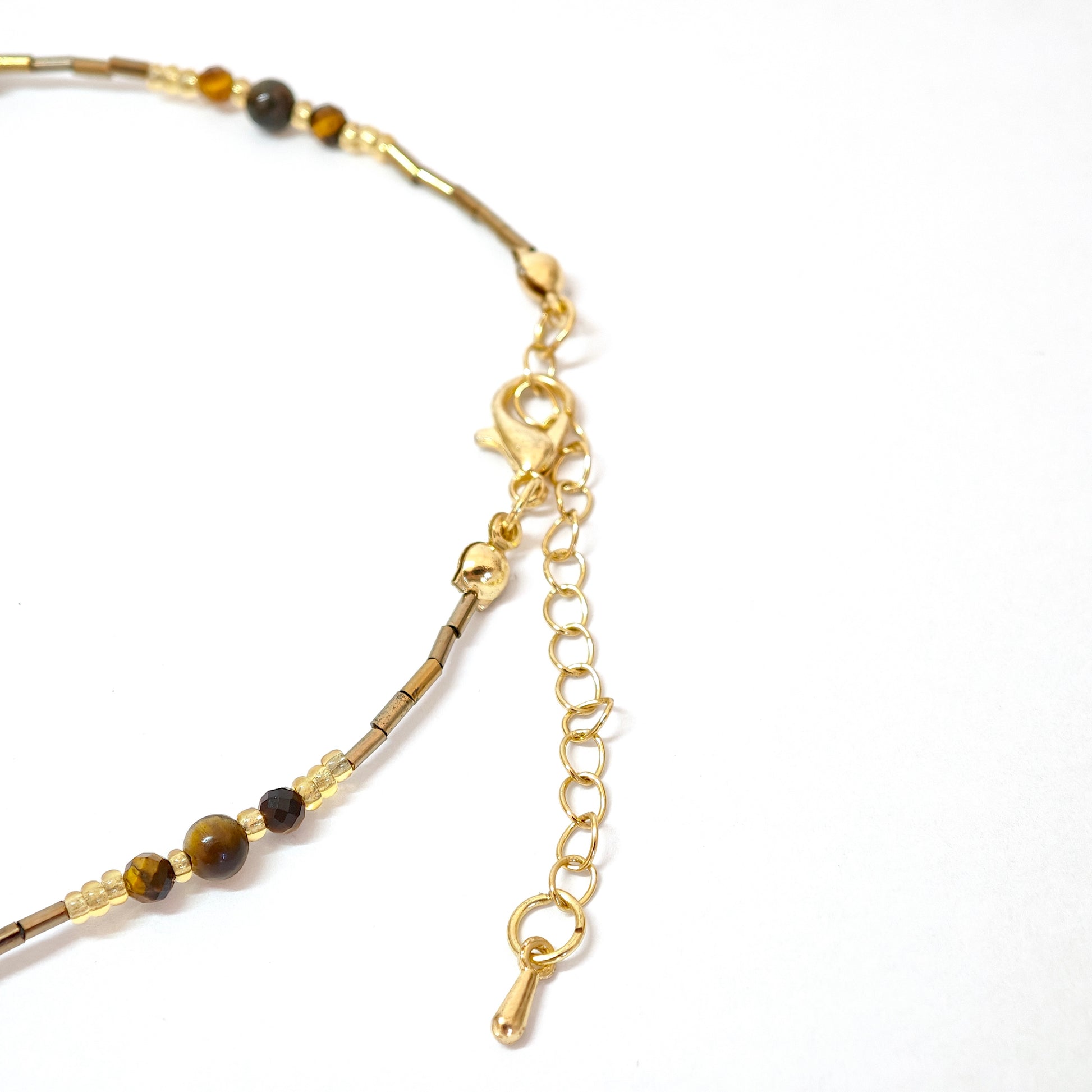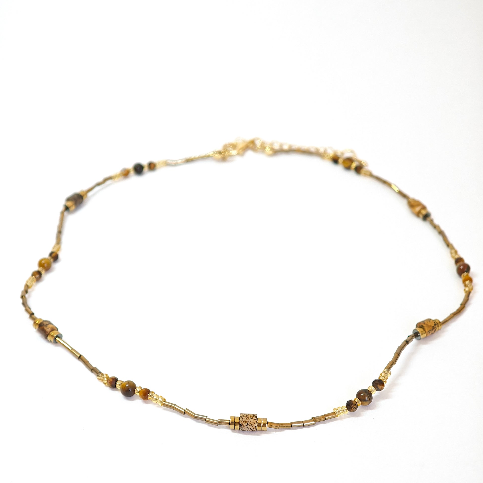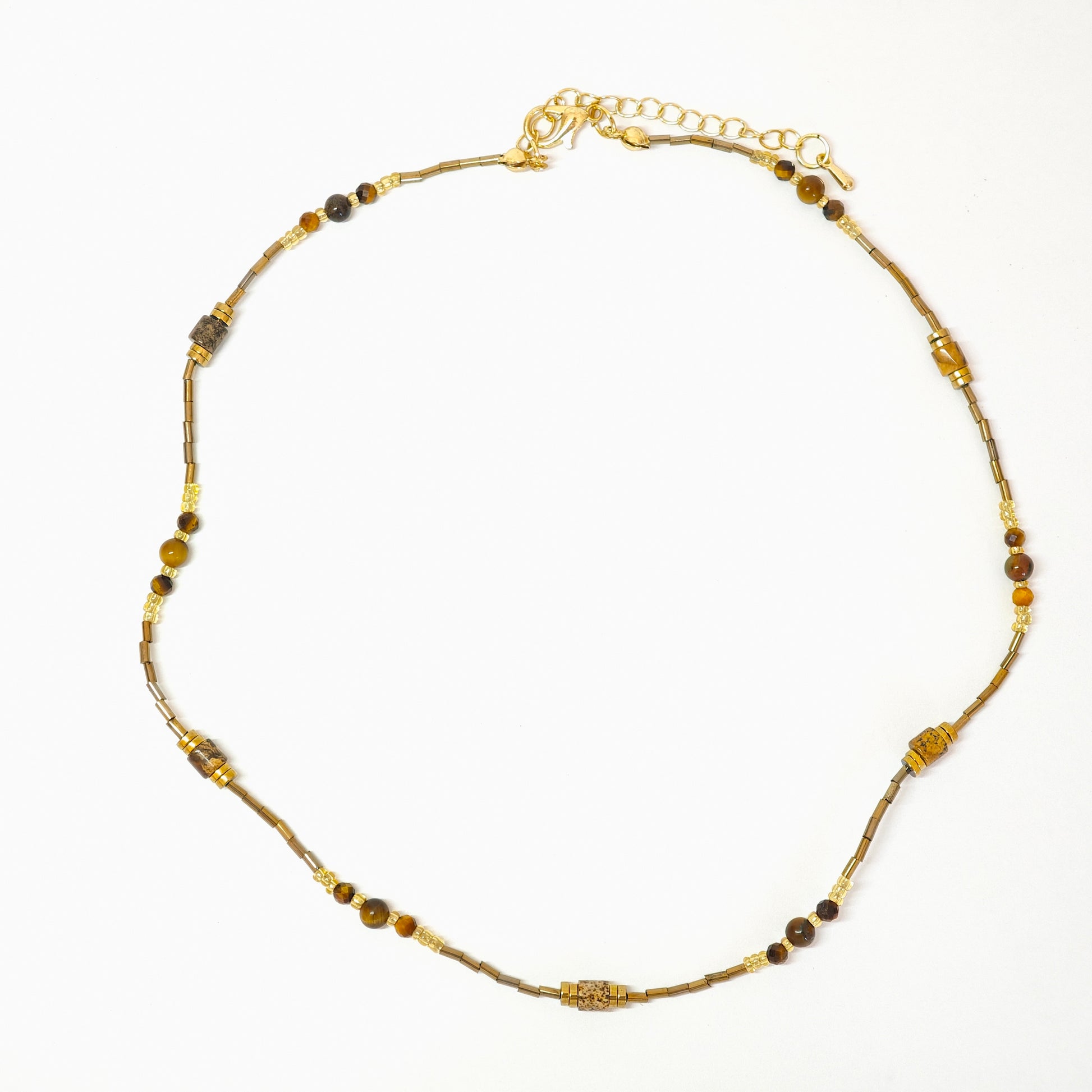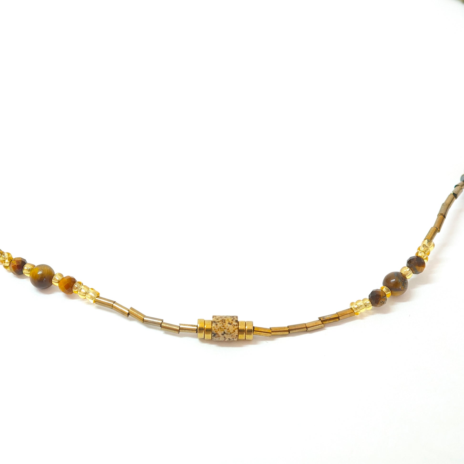 Feine goldfarbene Glasperlen, kombiniert mit Tigerauge und hellgelben Kristallen, bilden die Basis dieser Kette. Im Zentrum steht eine goldene, gravierte Zylinderperle als Blickfang. Die Farbpalette ist warm und dezent, mit subtilen Details.
