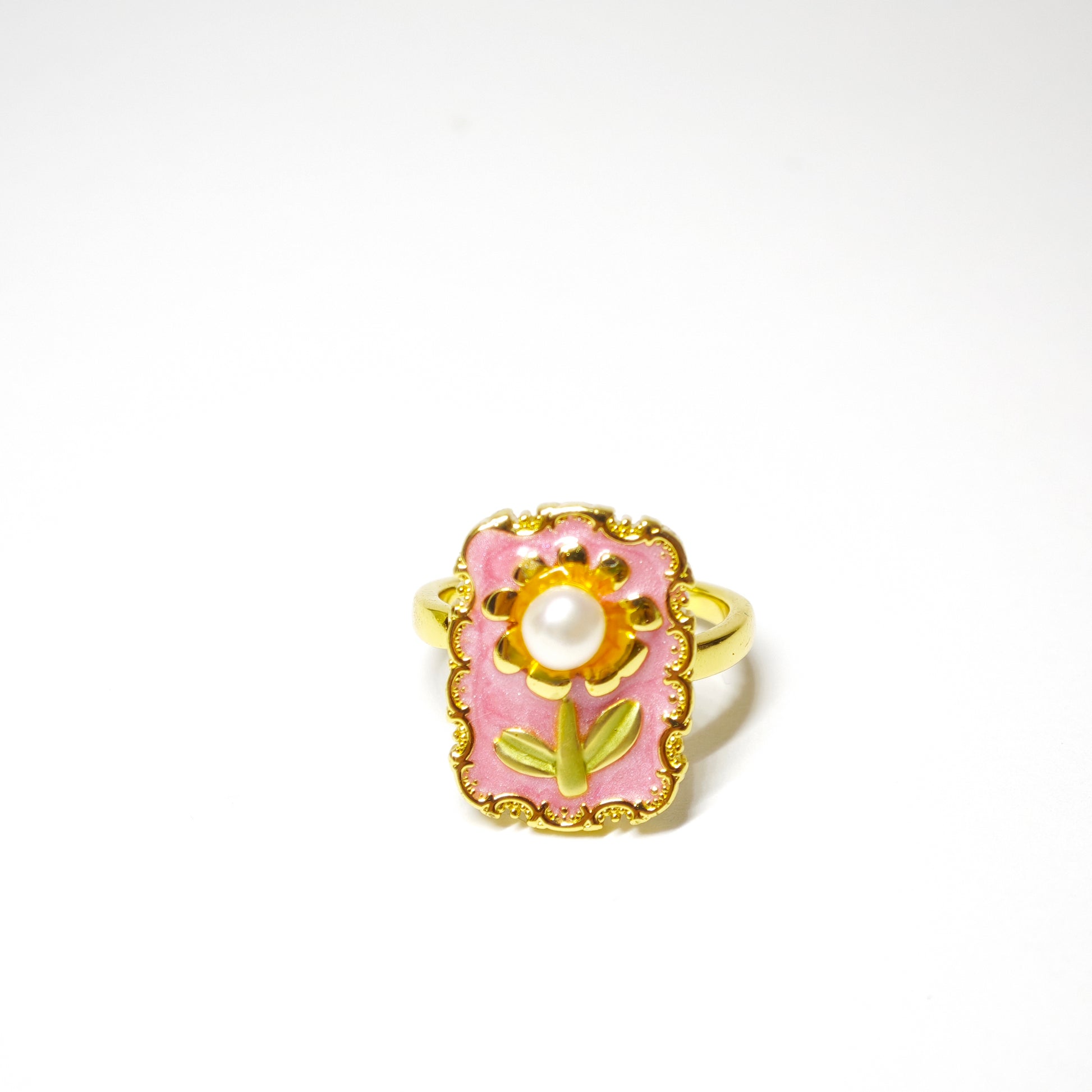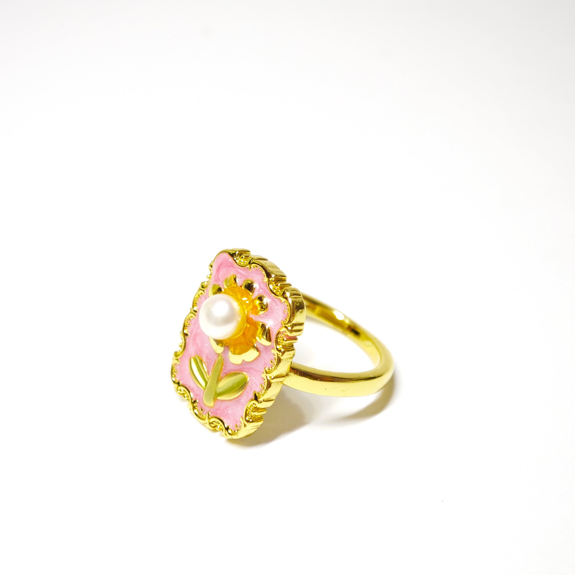 Der Ring „Sonnengarten“ trägt eine zarte rosa Harzfläche, umrahmt von goldenen Verzierungen – wie eine kleine Sommerpostkarte am Finger. In der Mitte erhebt sich eine goldene Blume mit einer schimmernden Kunstperle im Zentrum, wie ein Tautropfen im Sonnenlicht. Zwei grüne Emailleblätter verleihen dem Motiv Leben, als würde die Blume sich dem Licht entgegenstrecken.