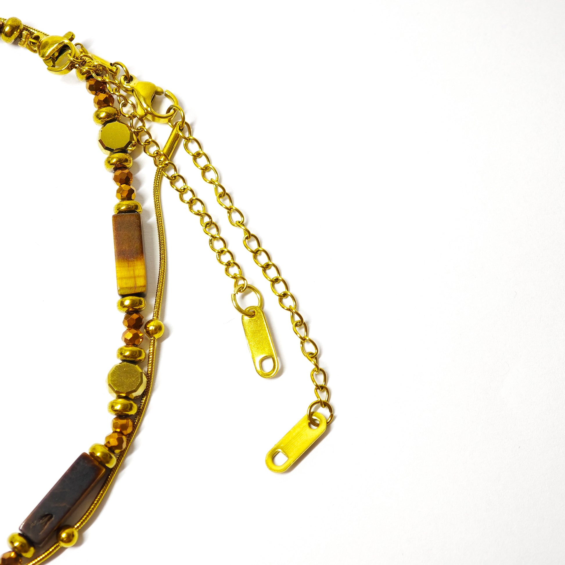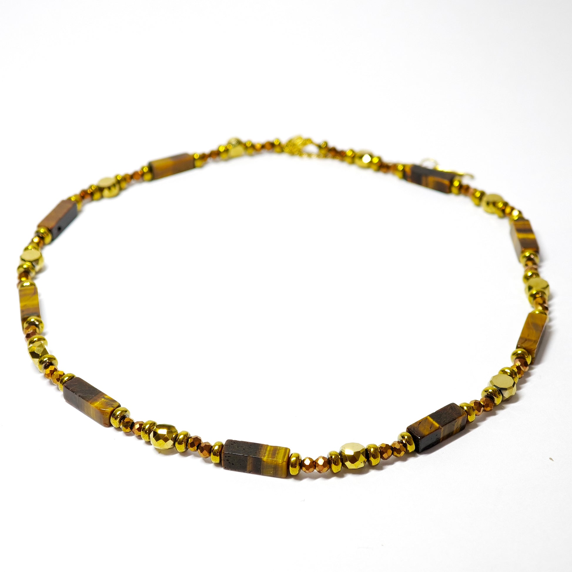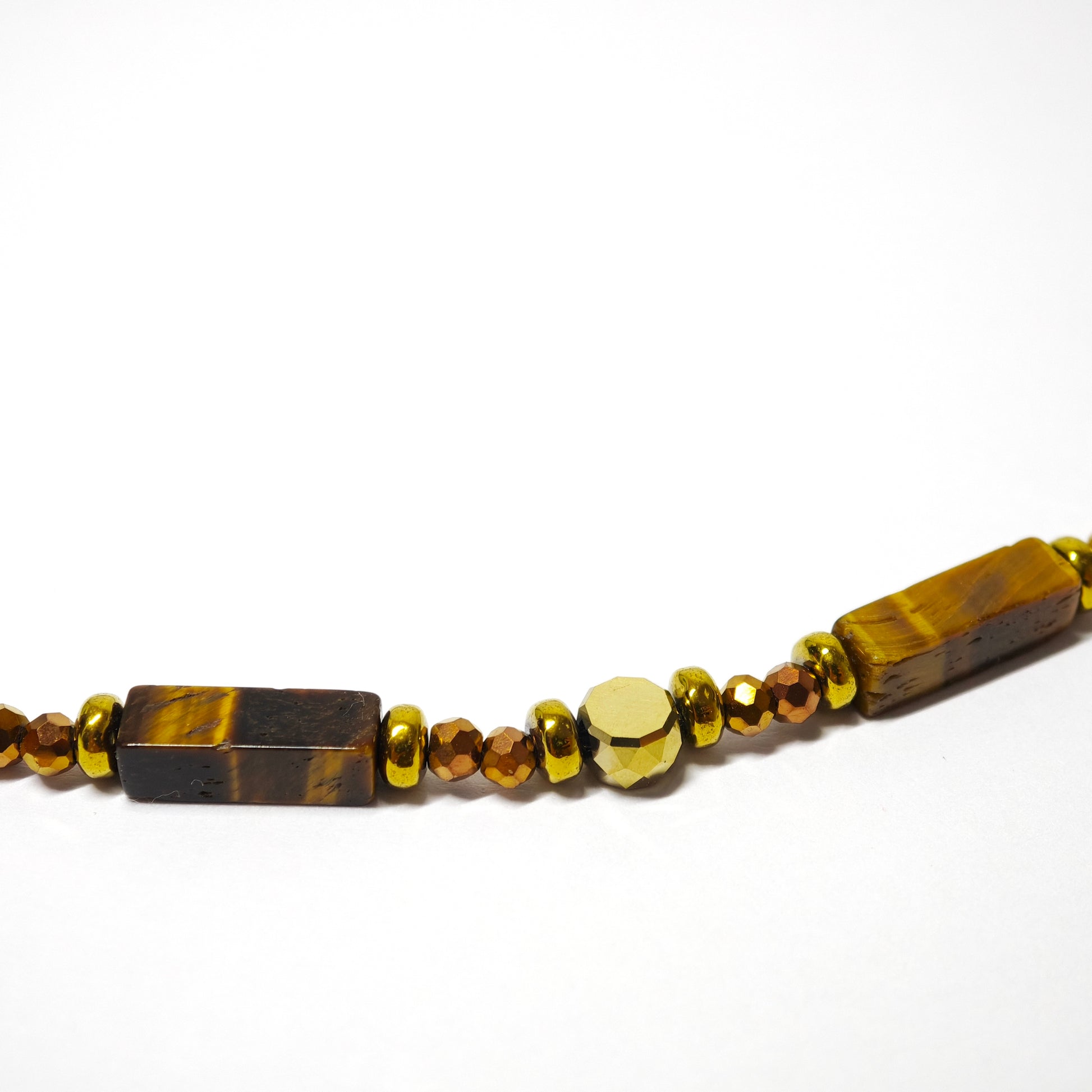 Gefertigt aus rechteckig und rund geschliffenem Tigerauge, kombiniert mit goldfarbenen Perlen, entsteht eine facettenreiche, schimmernde Optik. Der charakteristische Katzenaugeneffekt des Tigerauges zeigt sich dezent im Licht und strahlt stille Stärke aus.